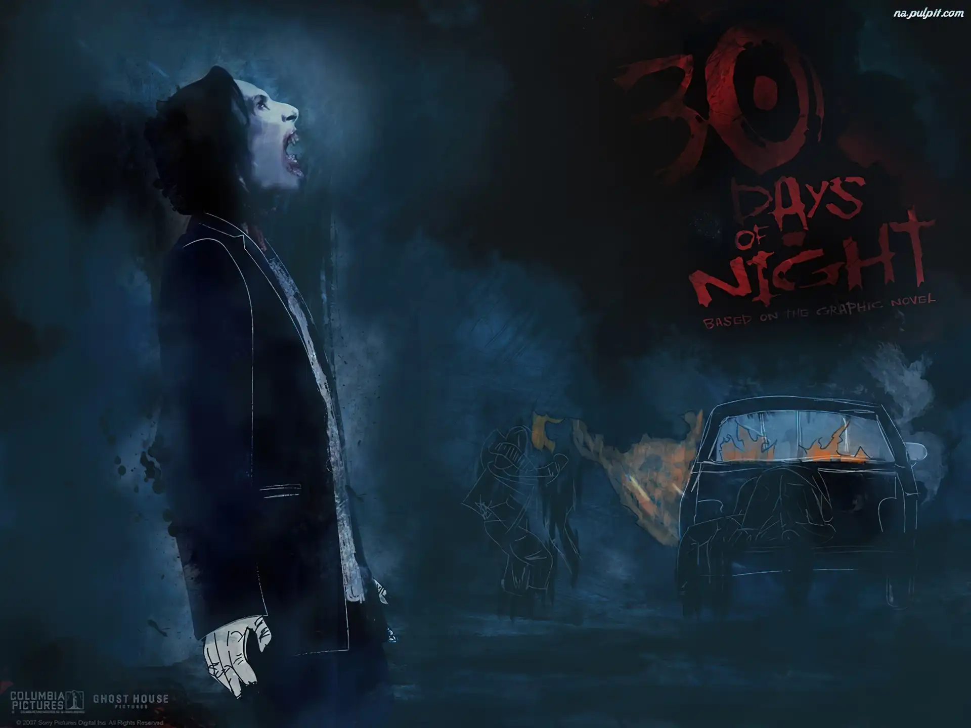 wilkołak, łysy, 30 Days Of Night, chłopak mróz, 30 Days Of Night, mężczyzna samochód, 30 Days Of Night, postać zima, 30 Days Of Night, tytuł płaszcz, mężczyzna, 30 Days Of Night, rysunek