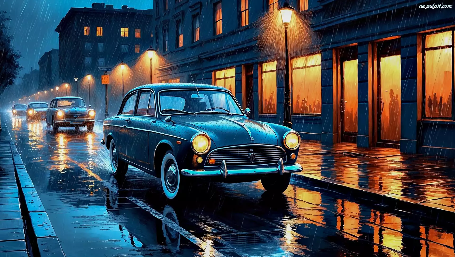 Grafika, Latarnie, Domy, Samochody, Ulica, Deszcz, Wieczór Na Pulpit