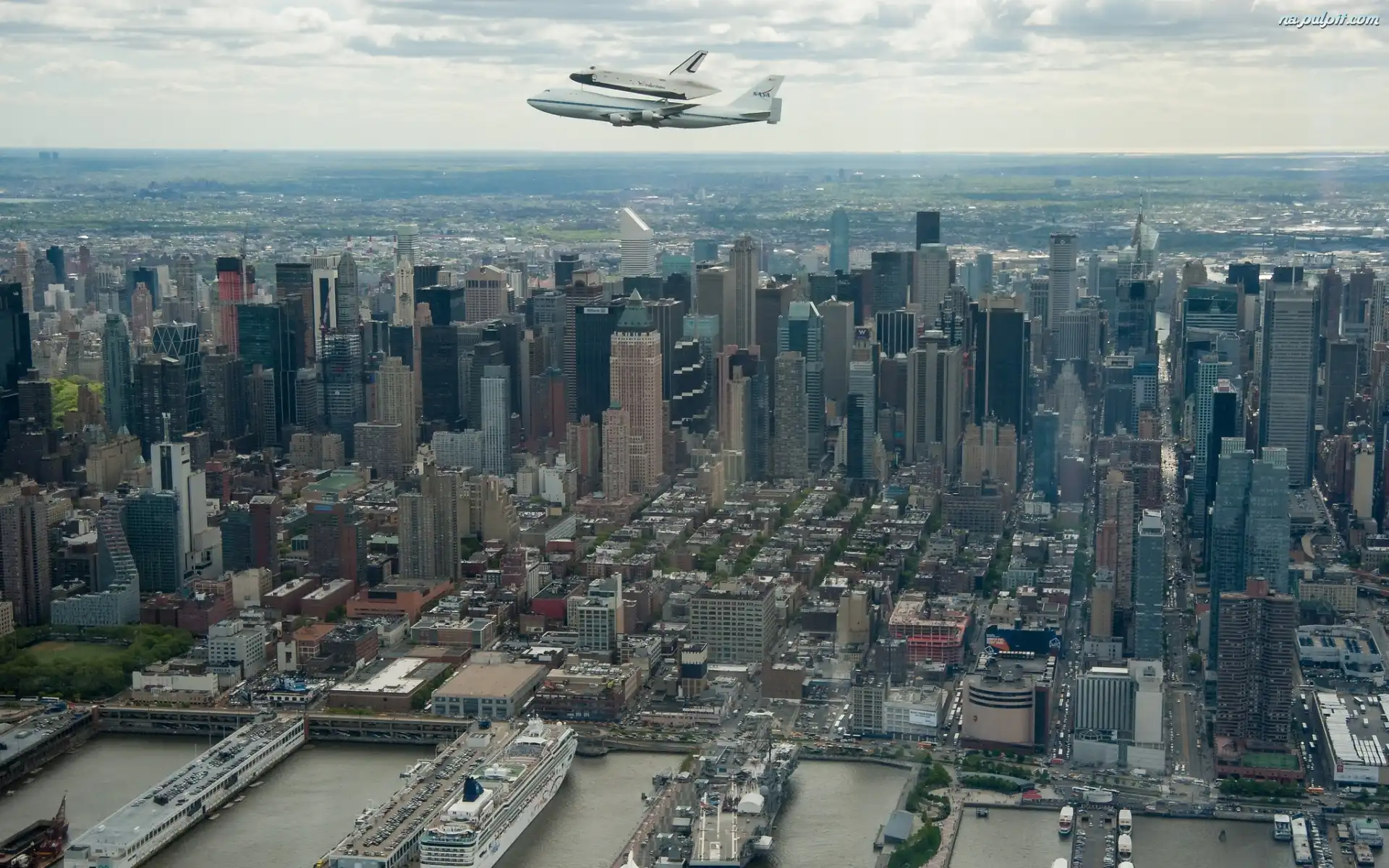 Samolot, Drapacze, Miasta, Panorama, Chmur