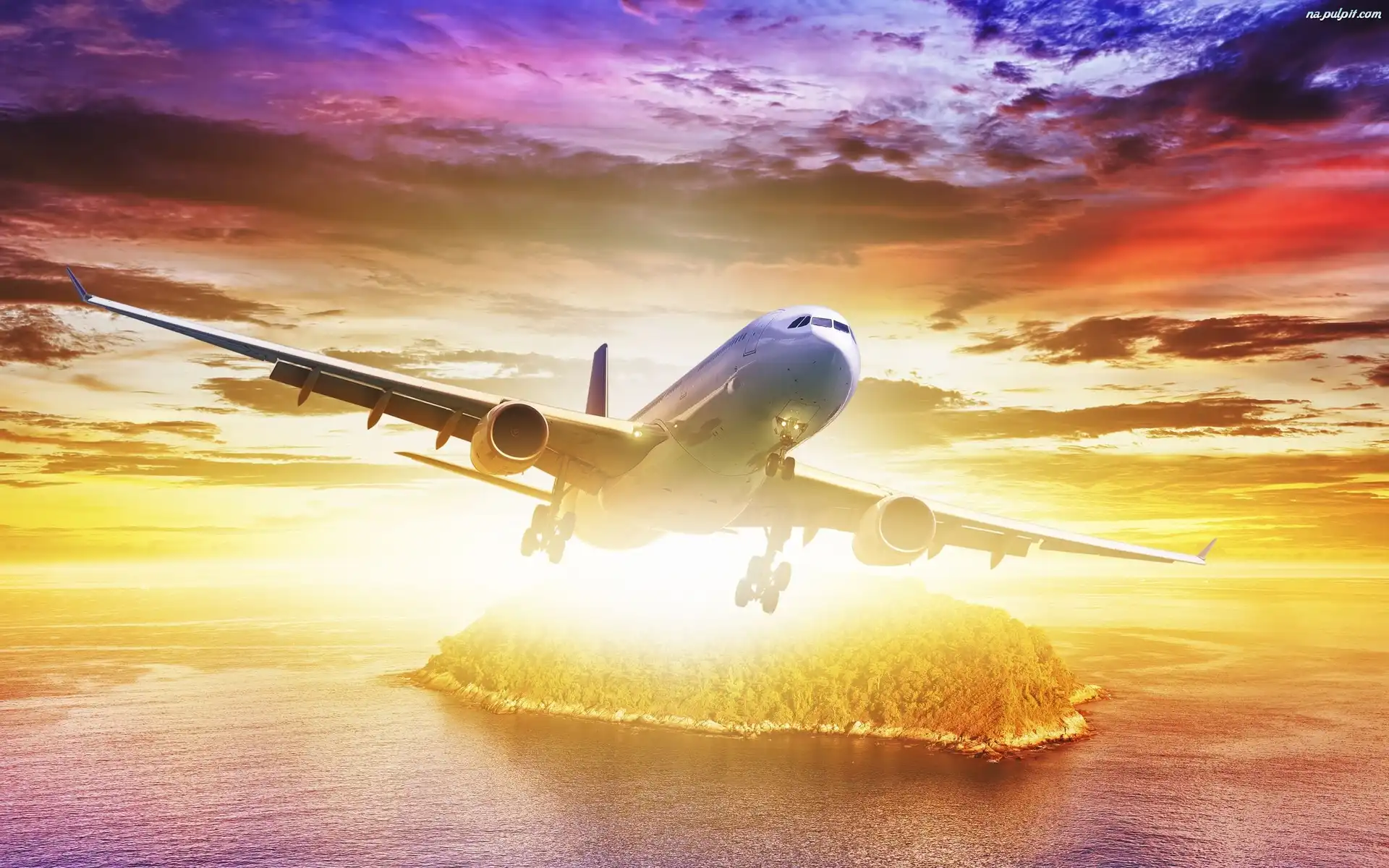 Samolot, Wyspa, Słońca, Zachód, Morze Na Pulpit