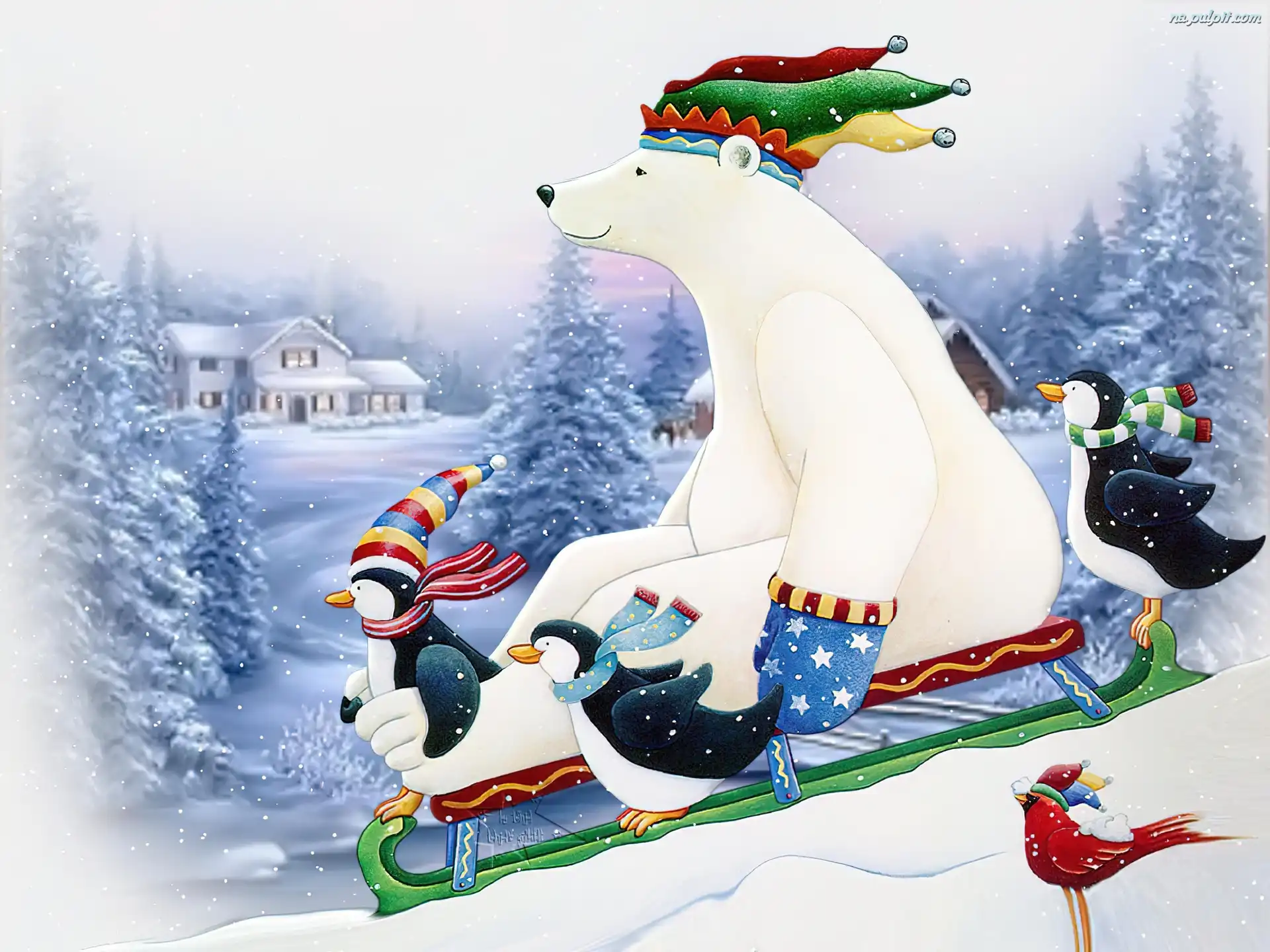 Sanie, Niedźwiedź, Zima, Pingwiny Na Pulpit