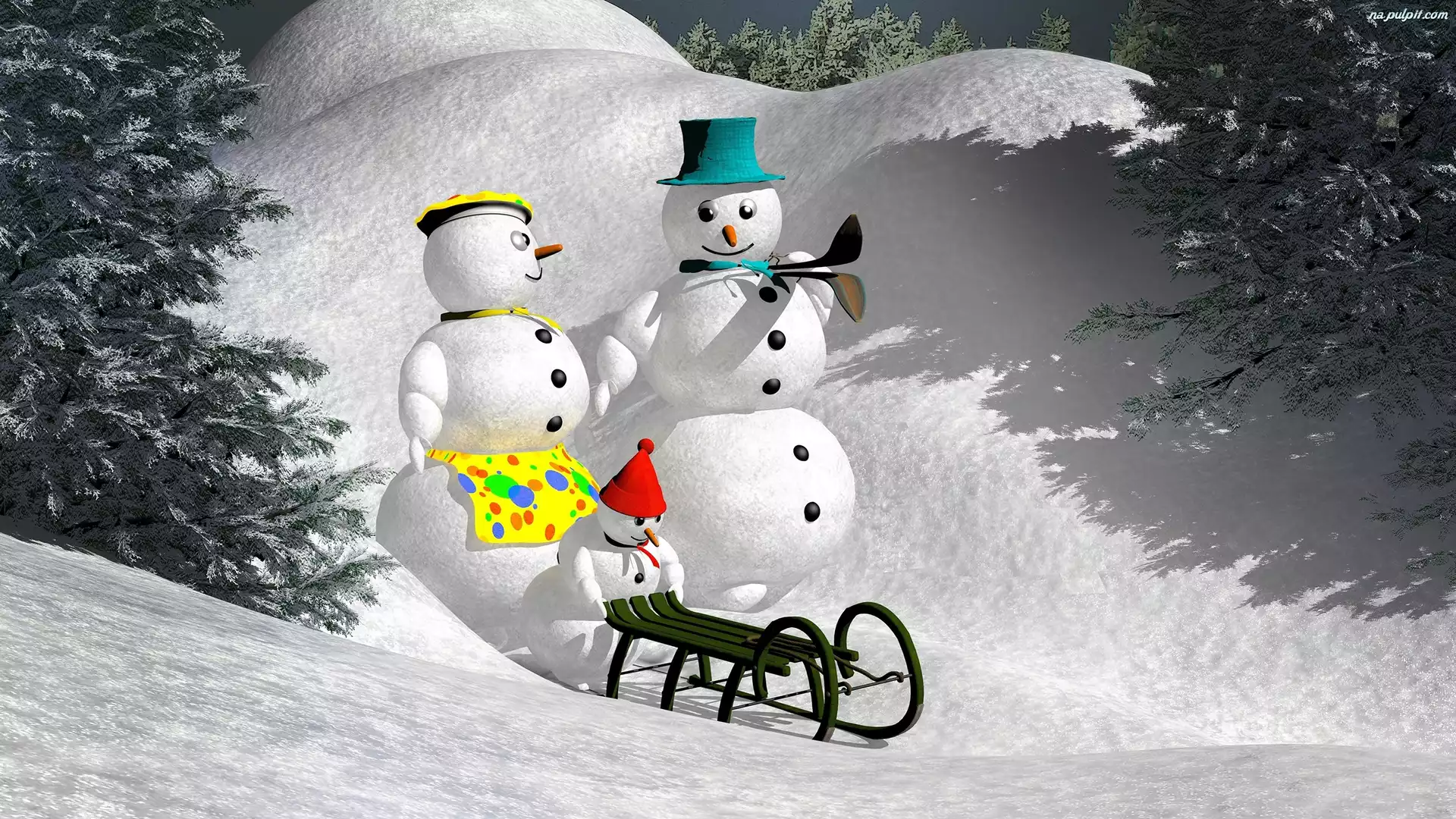 Sanki, Zima, Grafika, Drzewa, Bałwanki, Zaspy Na Pulpit