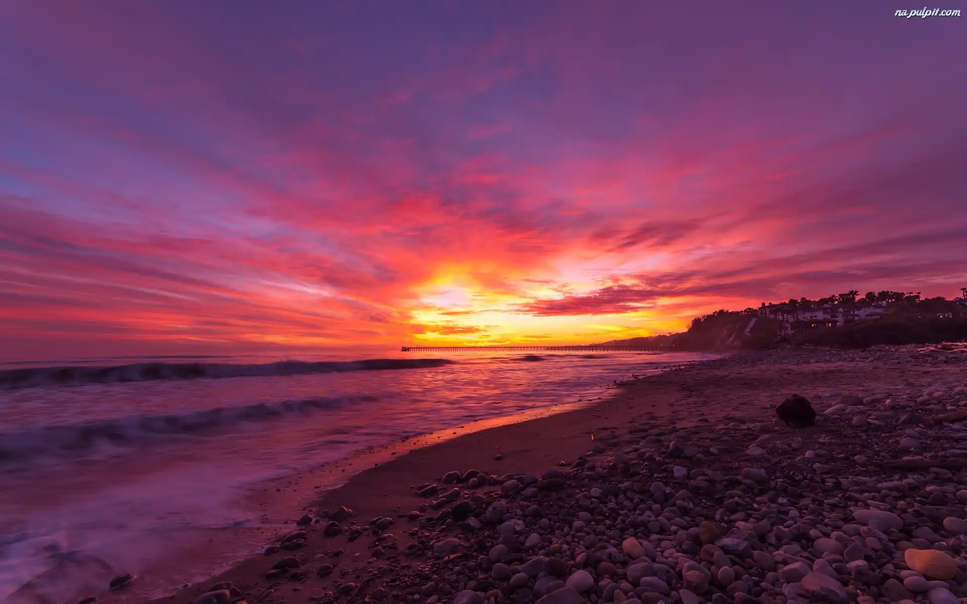 Santa Barbara, Plaża, El Capitan State Beach, Kamienie, Stan Kalifornia, Stany Zjednoczone, Molo, Morze, Zachód słońca Na Pulpit |