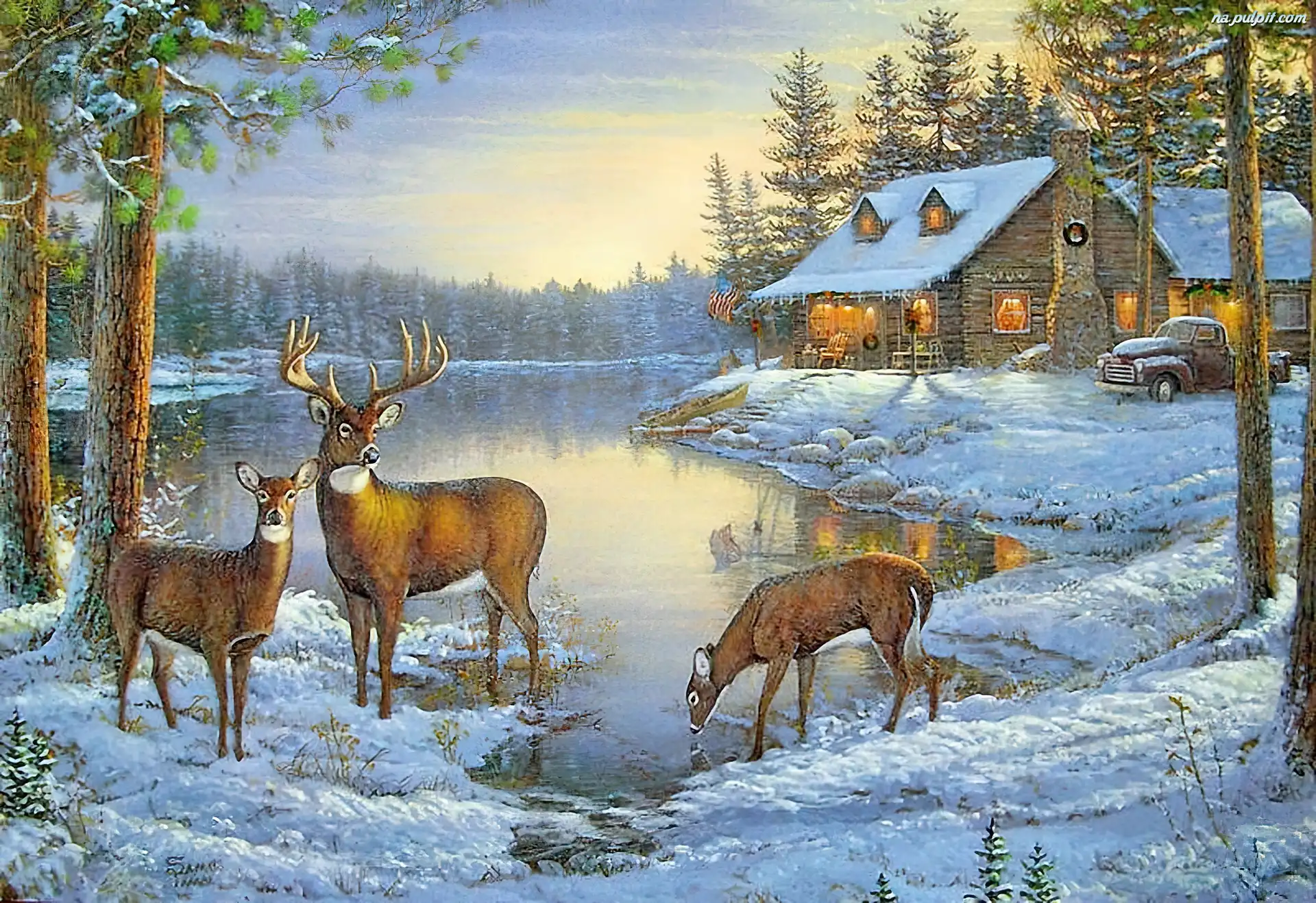 Sarny, Zima, Jezioro, Domek, Jeleń Na Pulpit