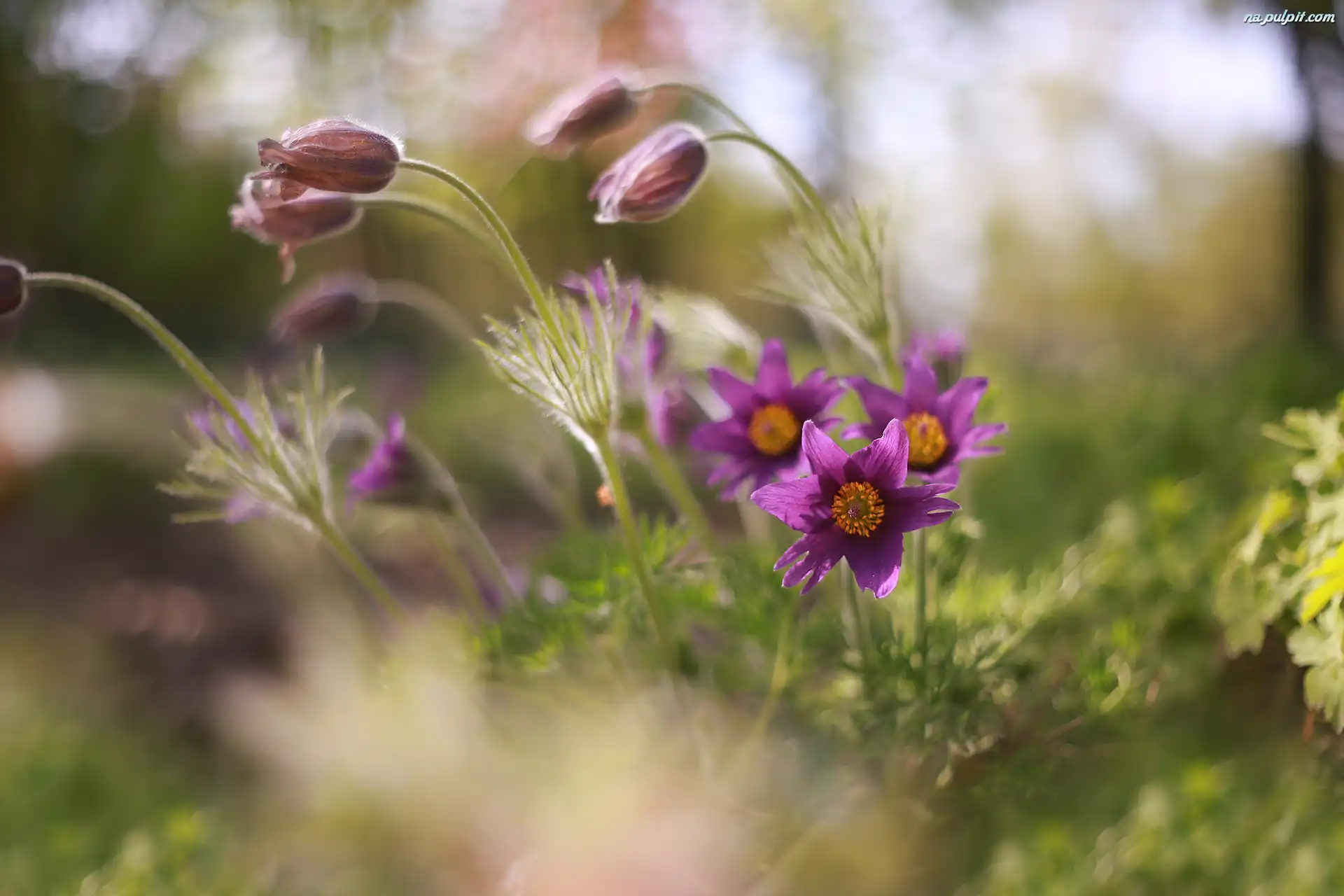 Fioletowe, Sasanki, Kwiaty, Rozmyte tło