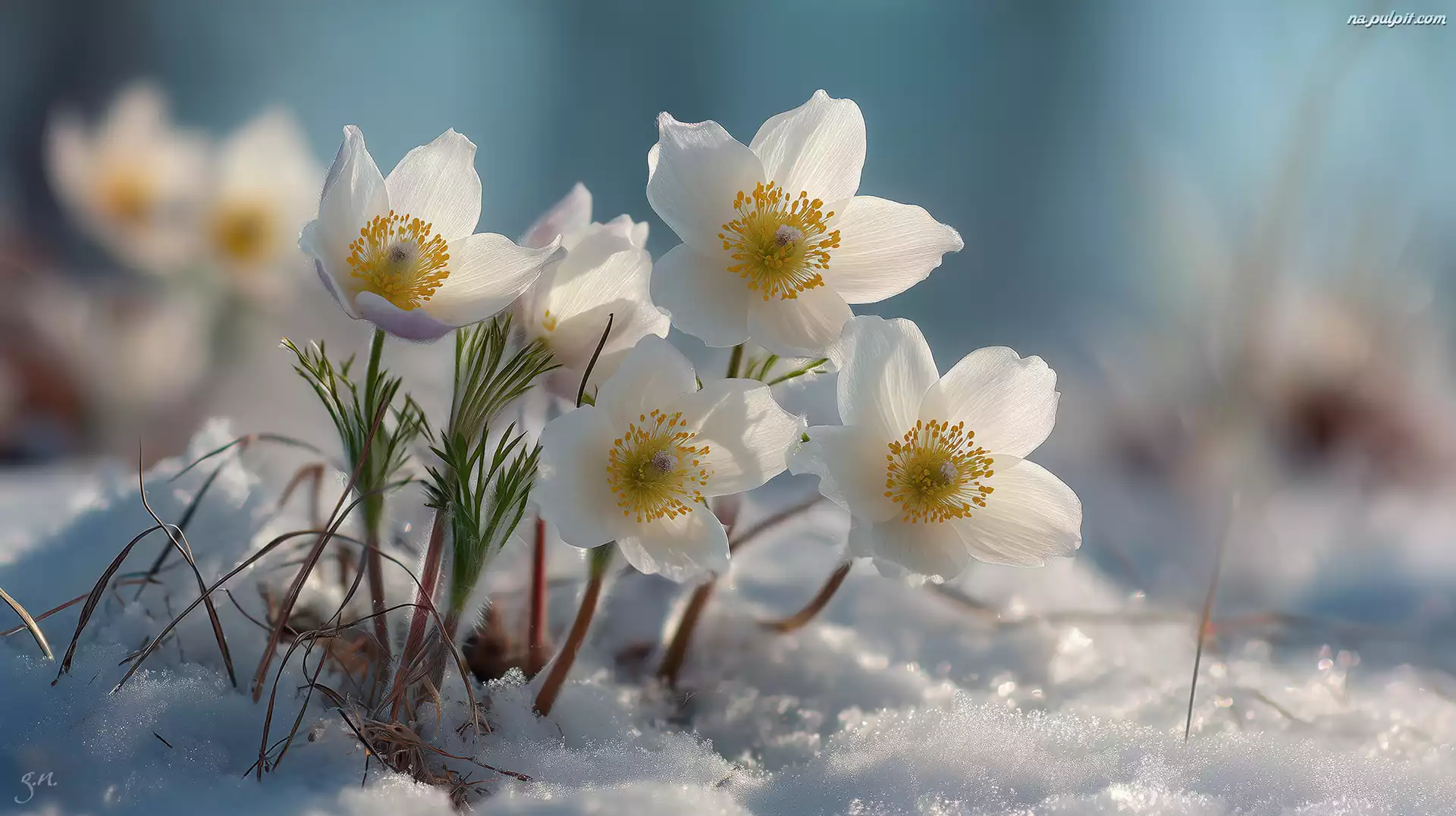 Białe, Sasanki, Śnieg, Grafika AI Na Pulpit