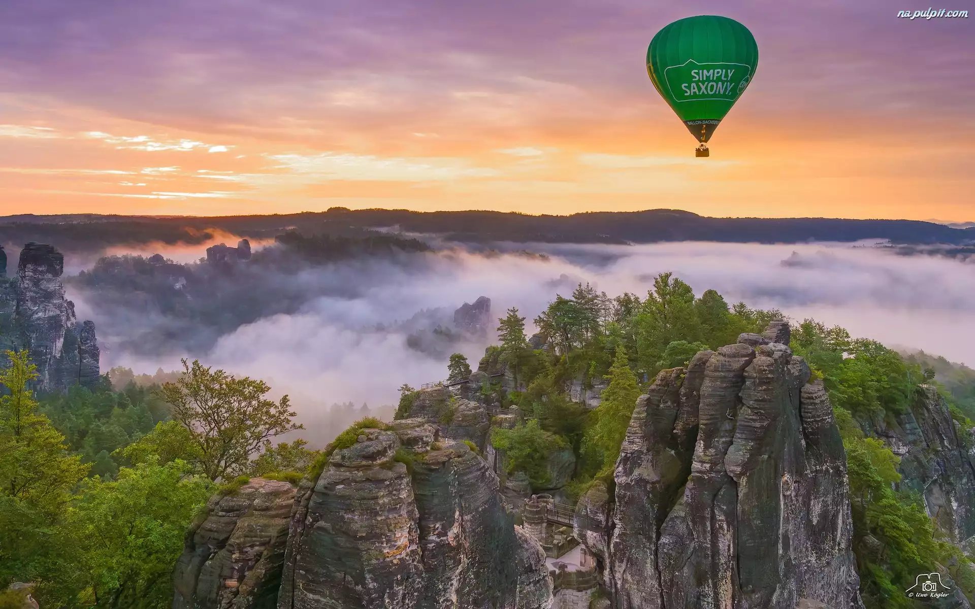 Drzewa, Mgła, Skały, Niemcy, Park Narodowy Saskiej Szwajcarii, Góry Połabskie, Balon