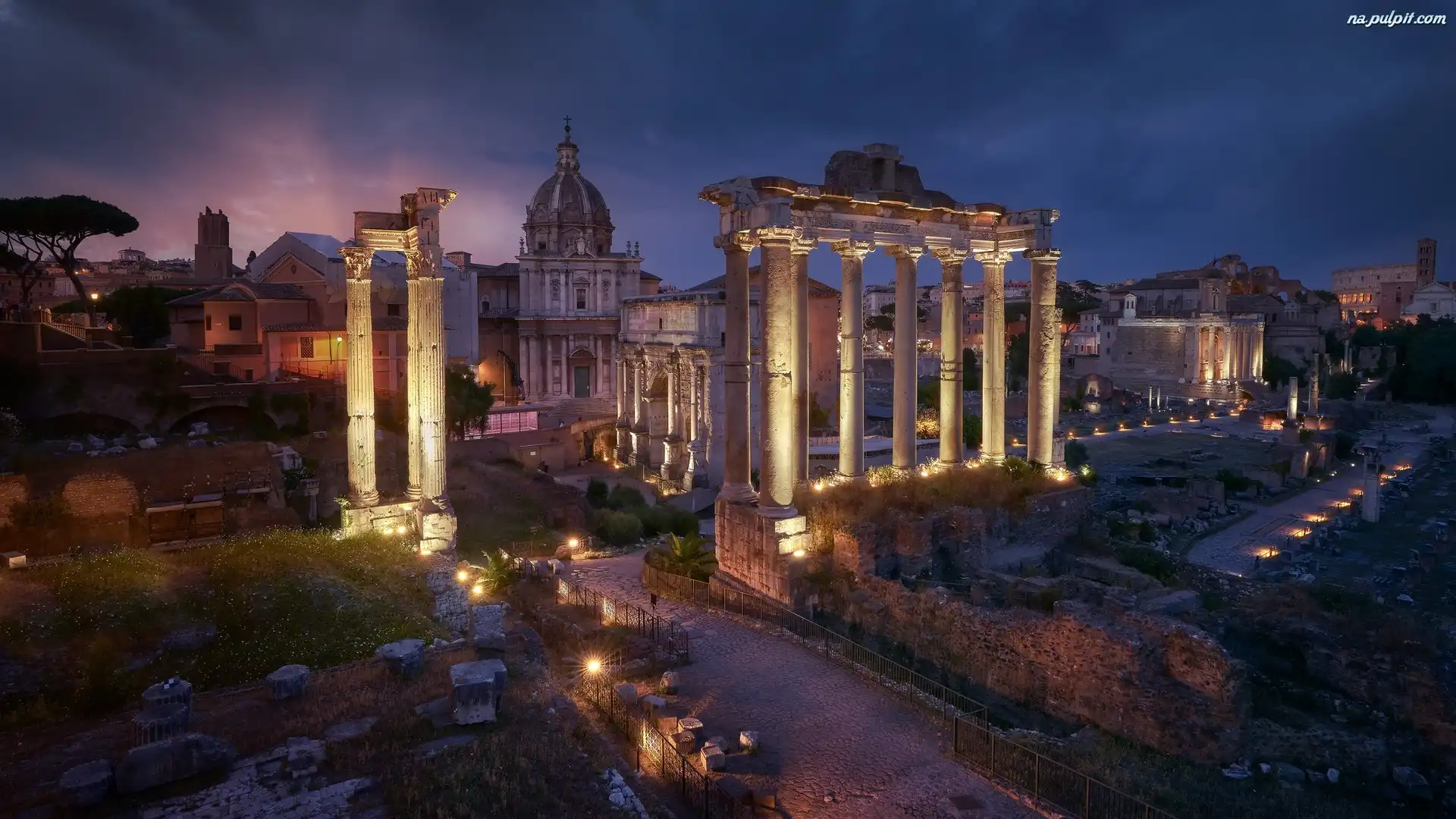 Światła, Rzym, Noc, Forum Romanum, Ruiny, Włochy, Świątynia Saturna Na Pulpit