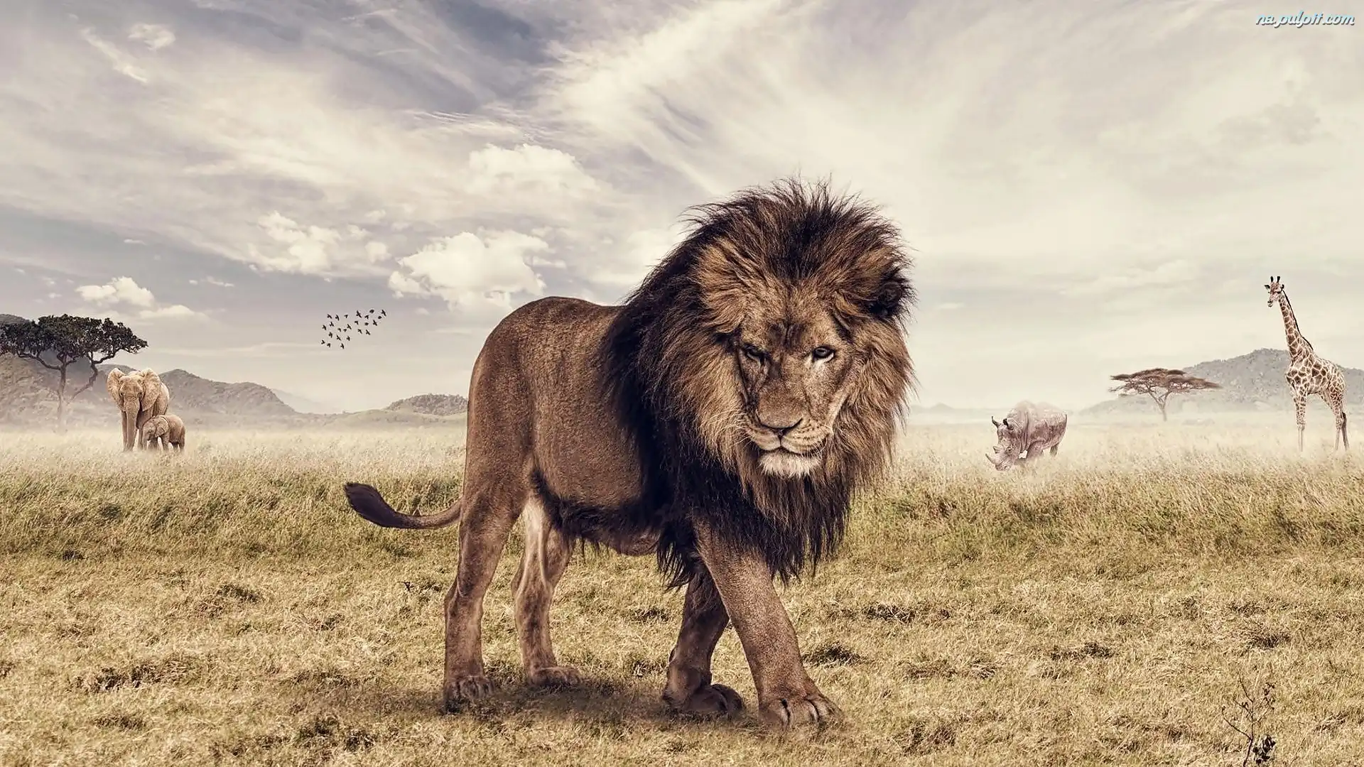 Nosorożec, Sawanna, Słonie, Lew, Zwierzęta, Rysunek, Żyrafa Na Pulpit