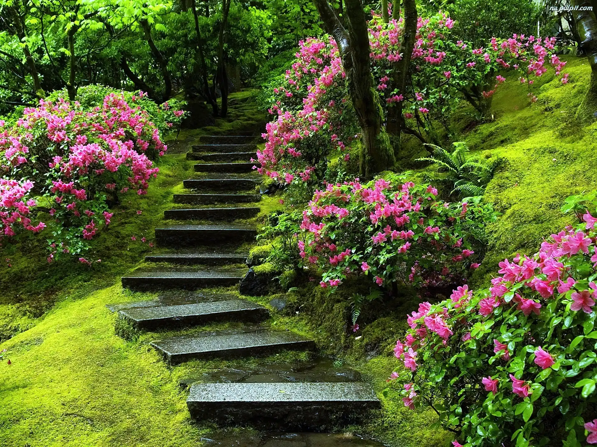 Schodki, Rododendrony, Kwitnące, Park, Kamienne