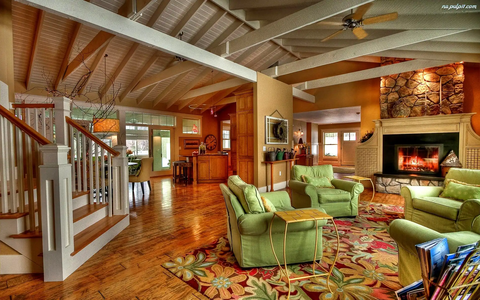 Fotele, Schody, Kominek, Salon, Zielone Na Pulpit