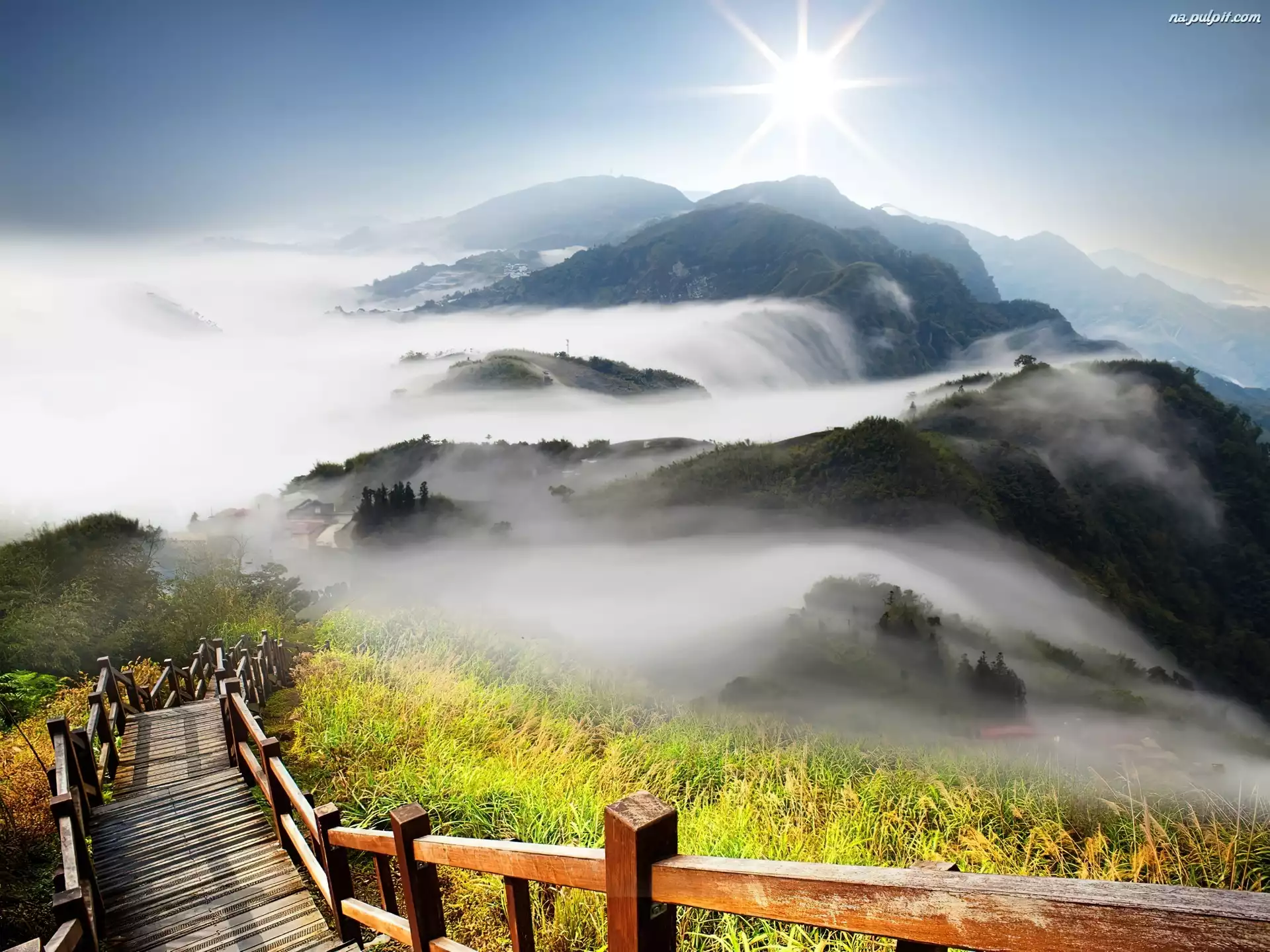 Schody, Promienie, Mgła, Góry, Słoneczne Na Pulpit