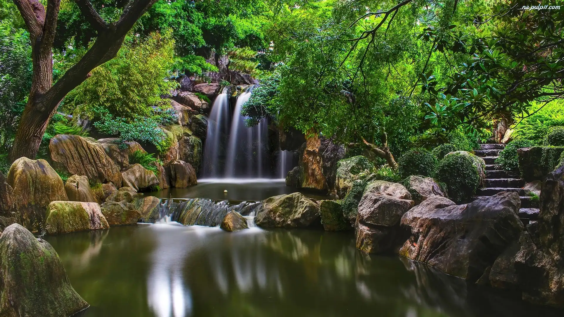 Schody, Kamienie, Wodospad, Drzewa Na Pulpit