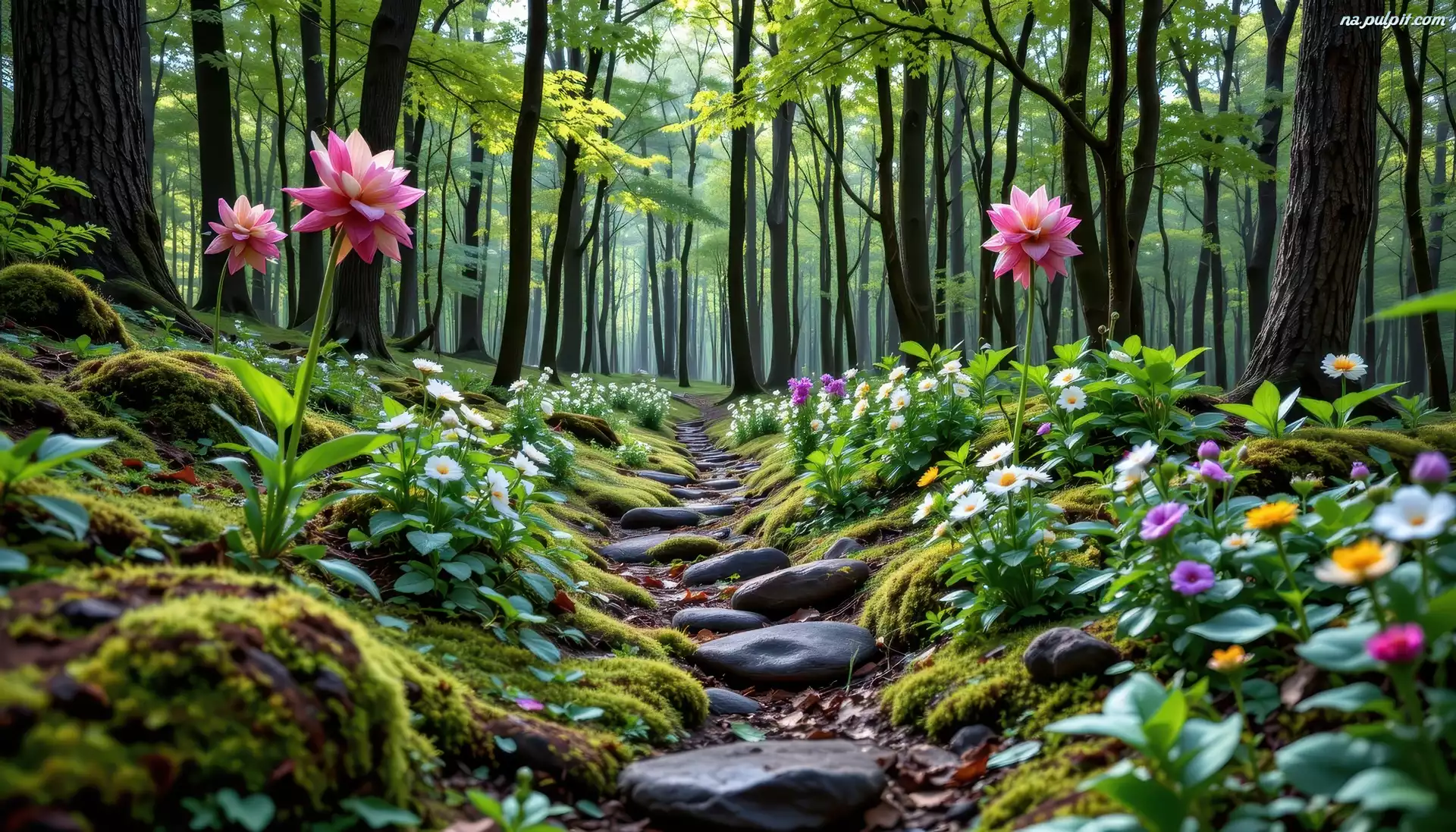 Kamienie, Las, Kwiaty, Ścieżka, Drzewa, Grafika AI Na Pulpit