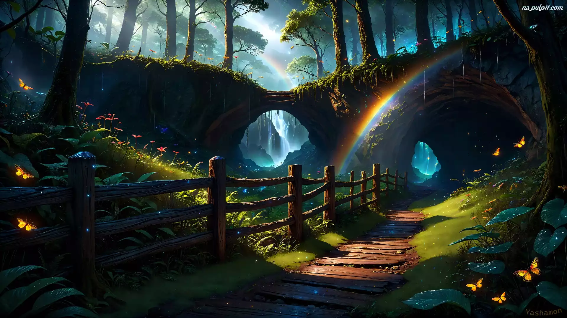 Las, Ścieżka, Płot, Grafika, Tęcza
