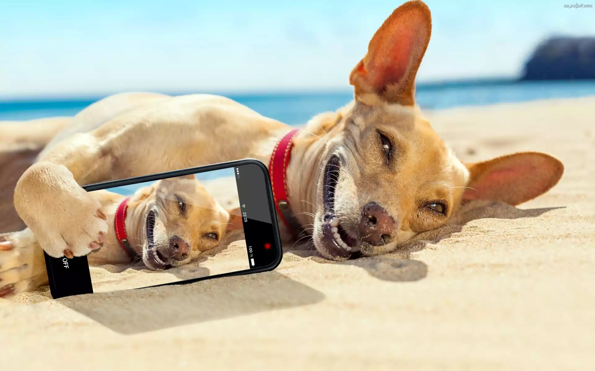 Selfie, Morze, Plaża, Pies, Telefon Na Pulpit