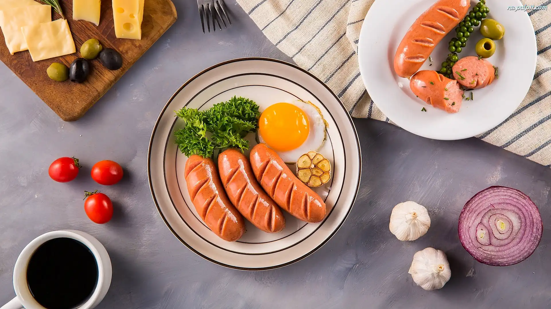 Parówki, Oliwki, Kukurydza, Jajko, Czosnek, Cebula, Kawa, Talerz, Śniadanie, Ser Na Pulpit