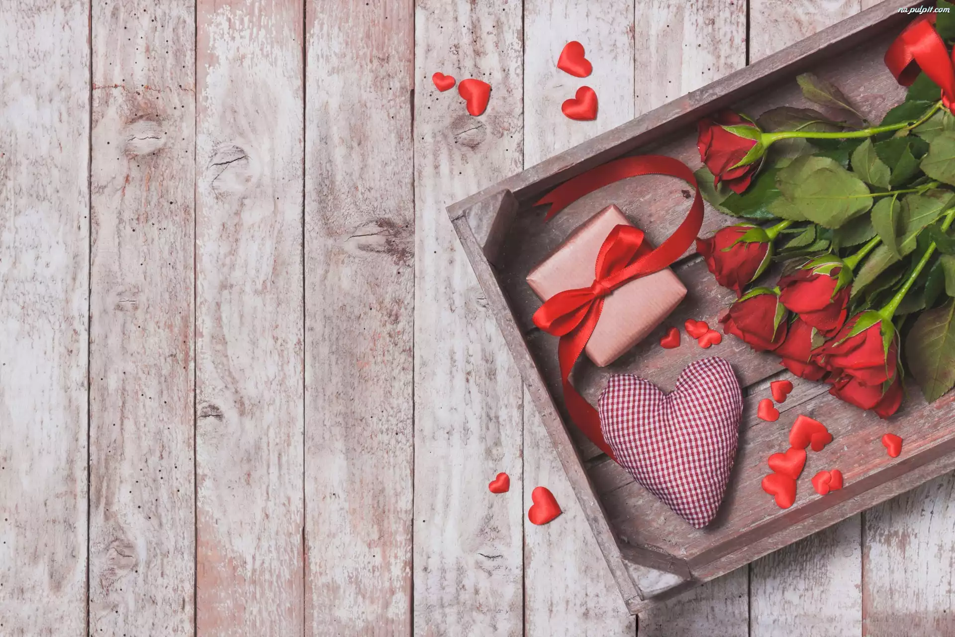 Kompozycja, Serce, Serduszka, Róże, Prezent, Skrzynka, Deski
