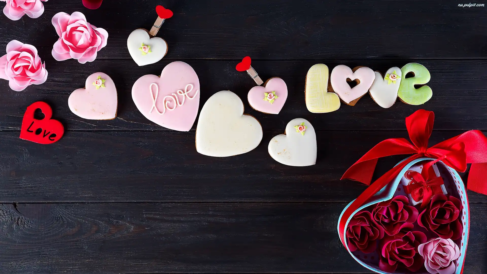 Pudełko, Serduszka, Napis, Wstążka, Deski, Love, Ciasteczka, Róże Na Pulpit