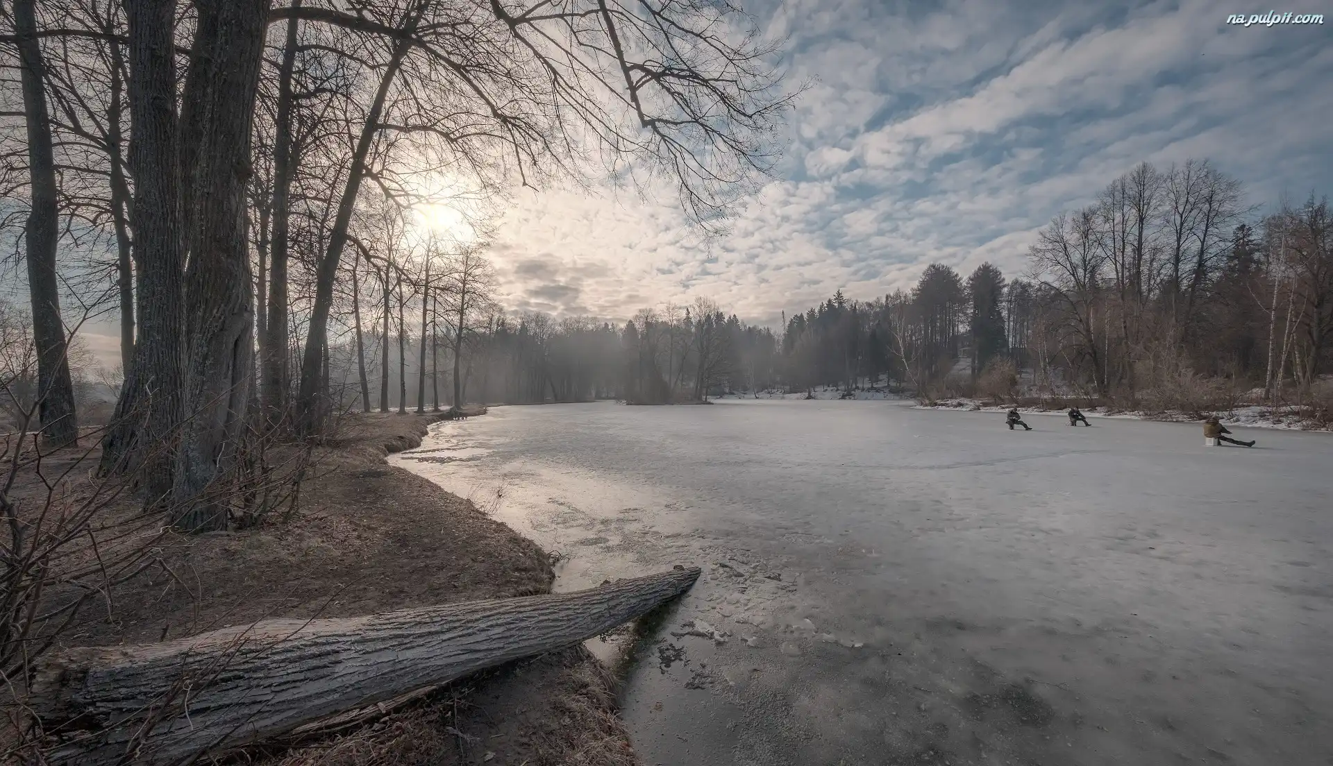 Rosja, Drzewa, Obwód moskiewski, Staw Barski, Wędkarze, Zima, Serednikowo Na Pulpit