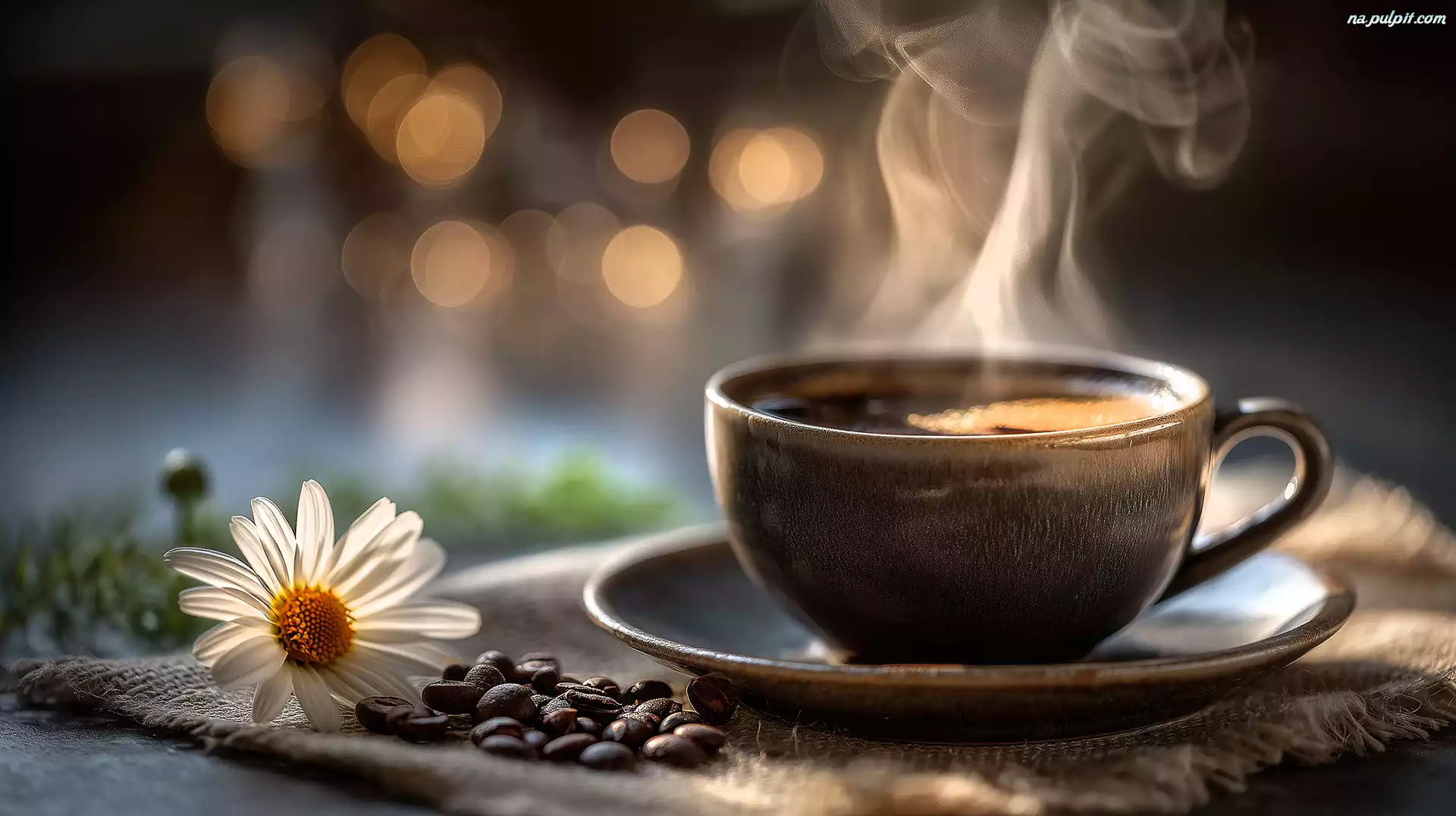 Grafika AI, Ziarna, Biały, Filiżanka, Kawa, Kwiat, Serweta Na Pulpit
