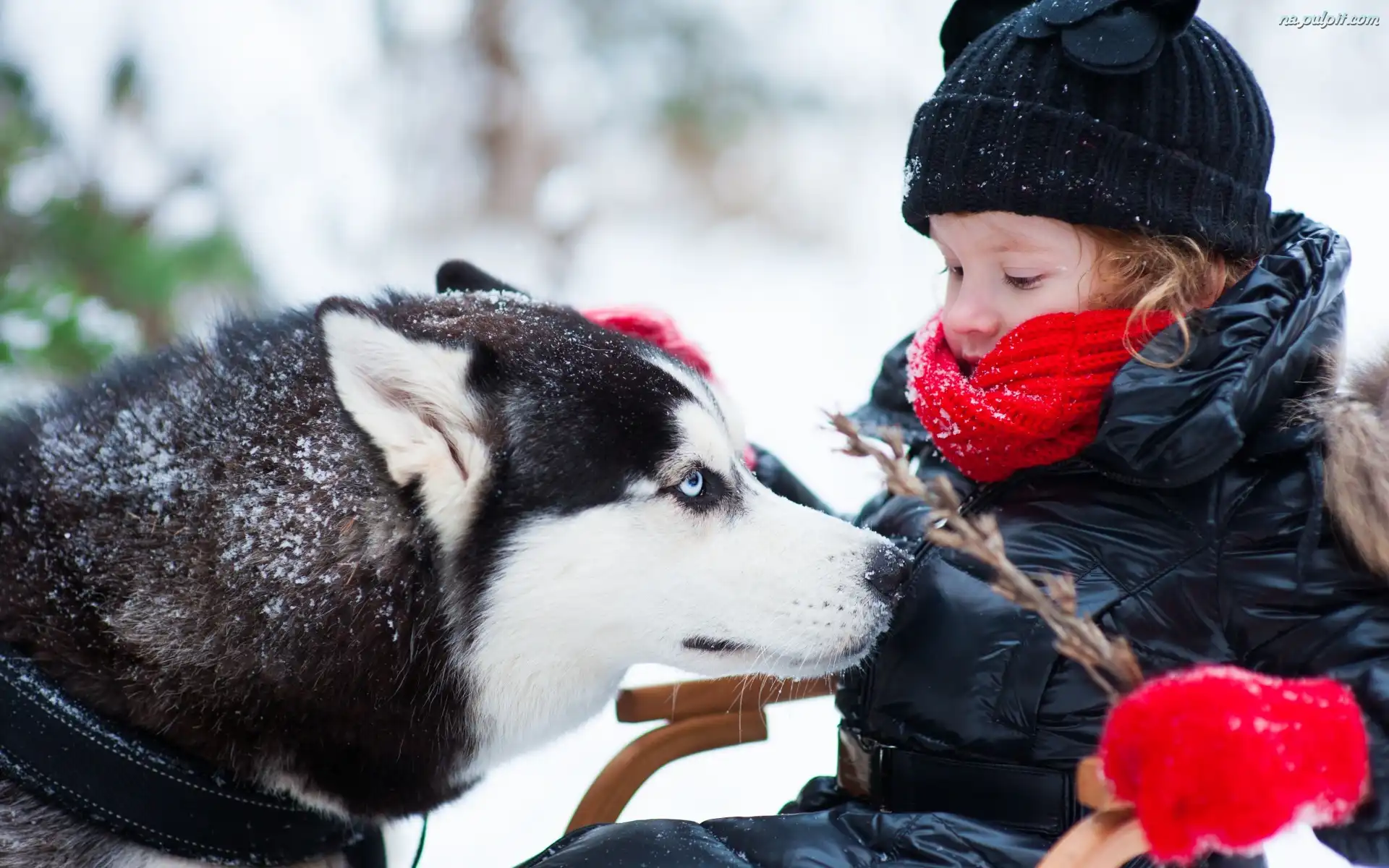 Siberian Husky, Gałązka, Zima, Dziecko, Pies