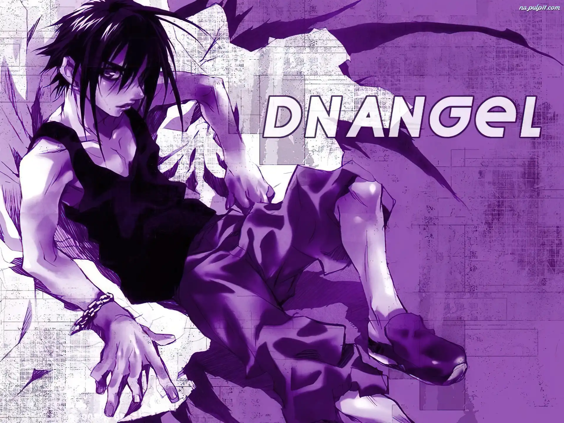 spojrzenie, siedzi, chłopak, D N Angel, napis Na Pulpit