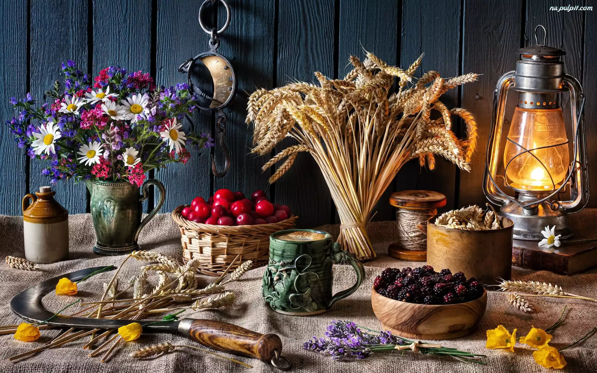 Sierp, Kubki, Bukiet Kwiatów, Zboże, Kłosy, Lampa, Kompozycja, Jeżyny, Czereśnie Na Pulpit