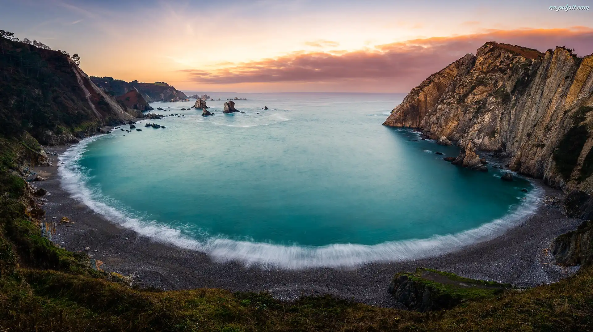 Playa del Silencio, Zachód słońca, Góry, Asturia, Hiszpania, Skały, Morze, Plaża Na Pulpit