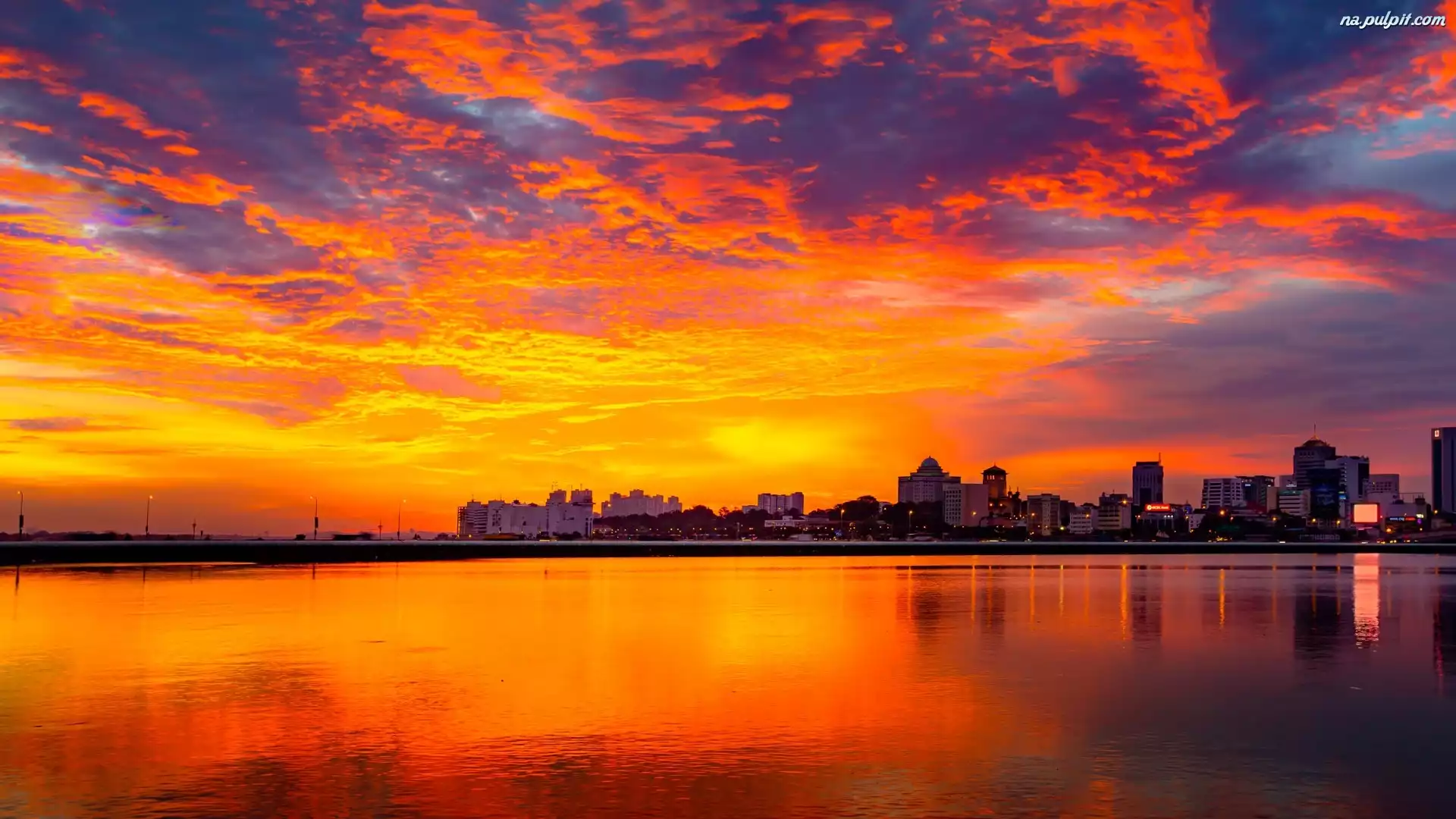 Miasto, Zachód słońca, Niebo, Cieśnina Johor, Kolorowe, Singapur Na Pulpit