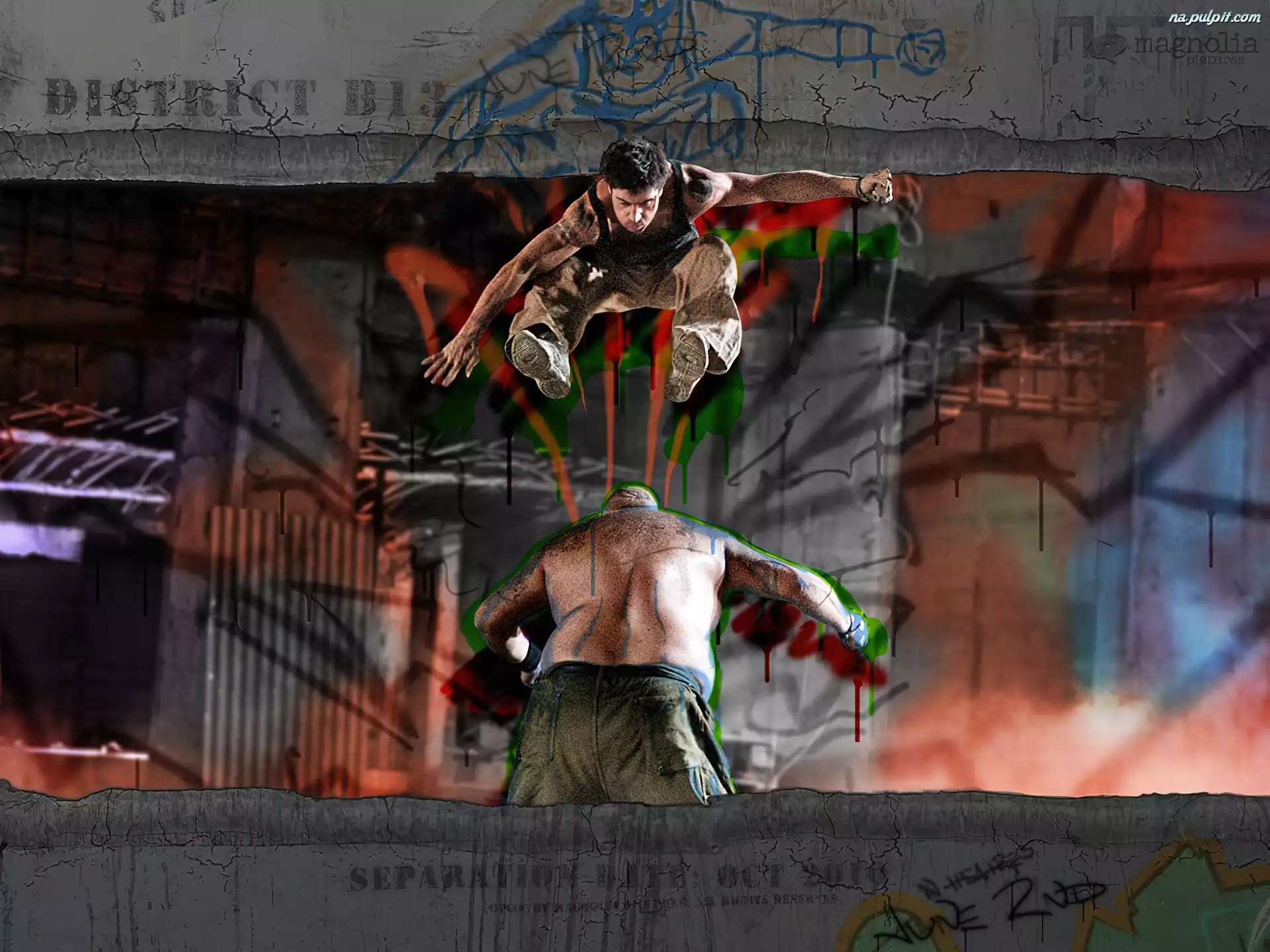 strzela, graffiti, District B13, chłopak skacze, District B13, mężczyźni