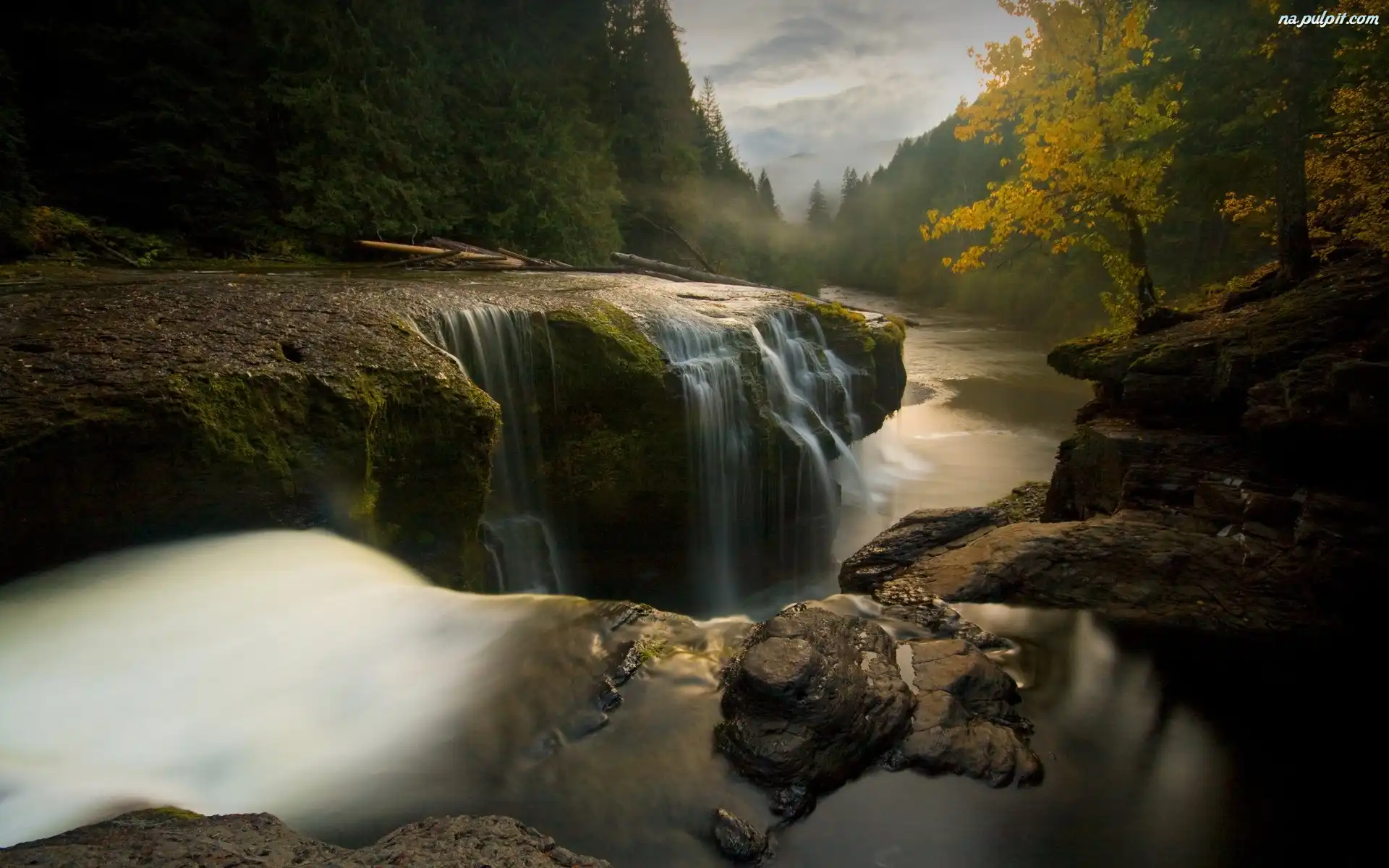 Słońca, Rzeki, Koryto, Zachód Samolotu, Widok, Las, Z Piękny Wodospad Wędkowanie, Las Sadzawka, Magiczny, Las Drzewa, Zieleń, Las, Zarośla Wodospad Las, Wodospad, Konar Wodospad Kolejka, Góry, Wodospad Bagno, Las, Mech Rzeka, Las, Kamienie, Mech Wodospad Góry, Rzeki Wodospad