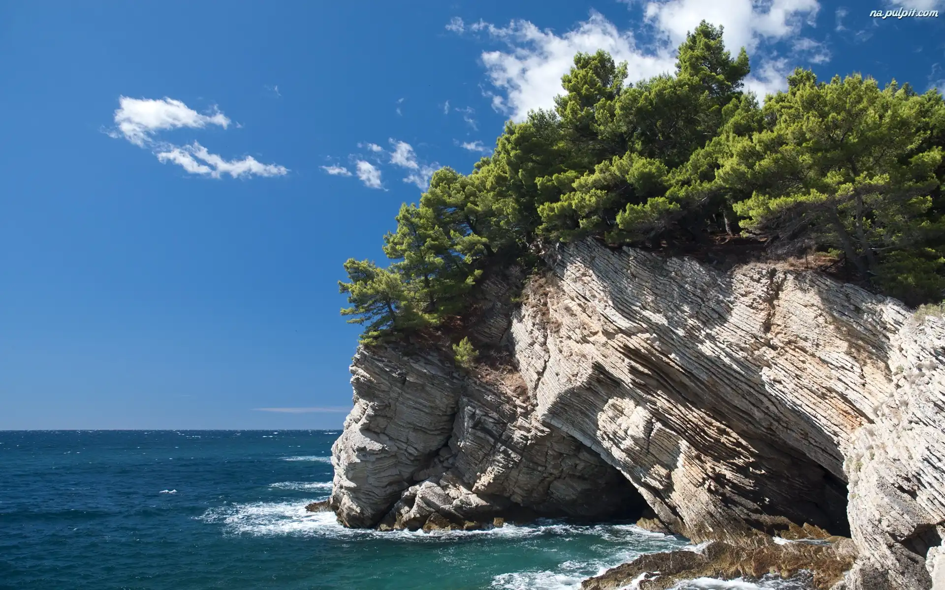 Skała, Chmury, Morze, Drzewa Na Pulpit