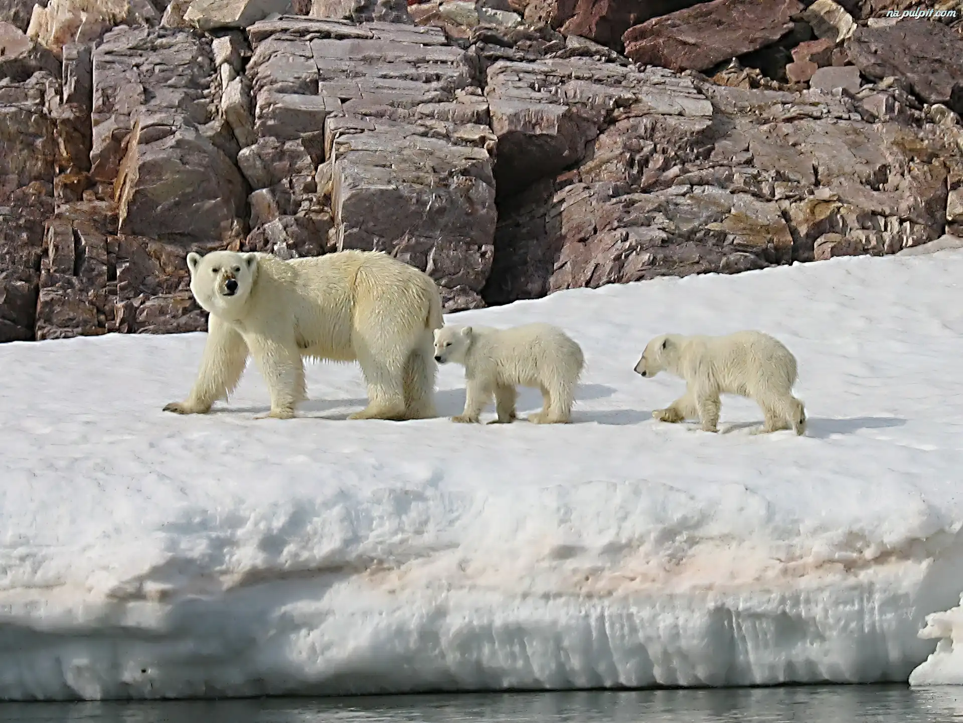 Skała, Dzieci, Mama, Niedzwiedź Polarny, Lód Na Pulpit