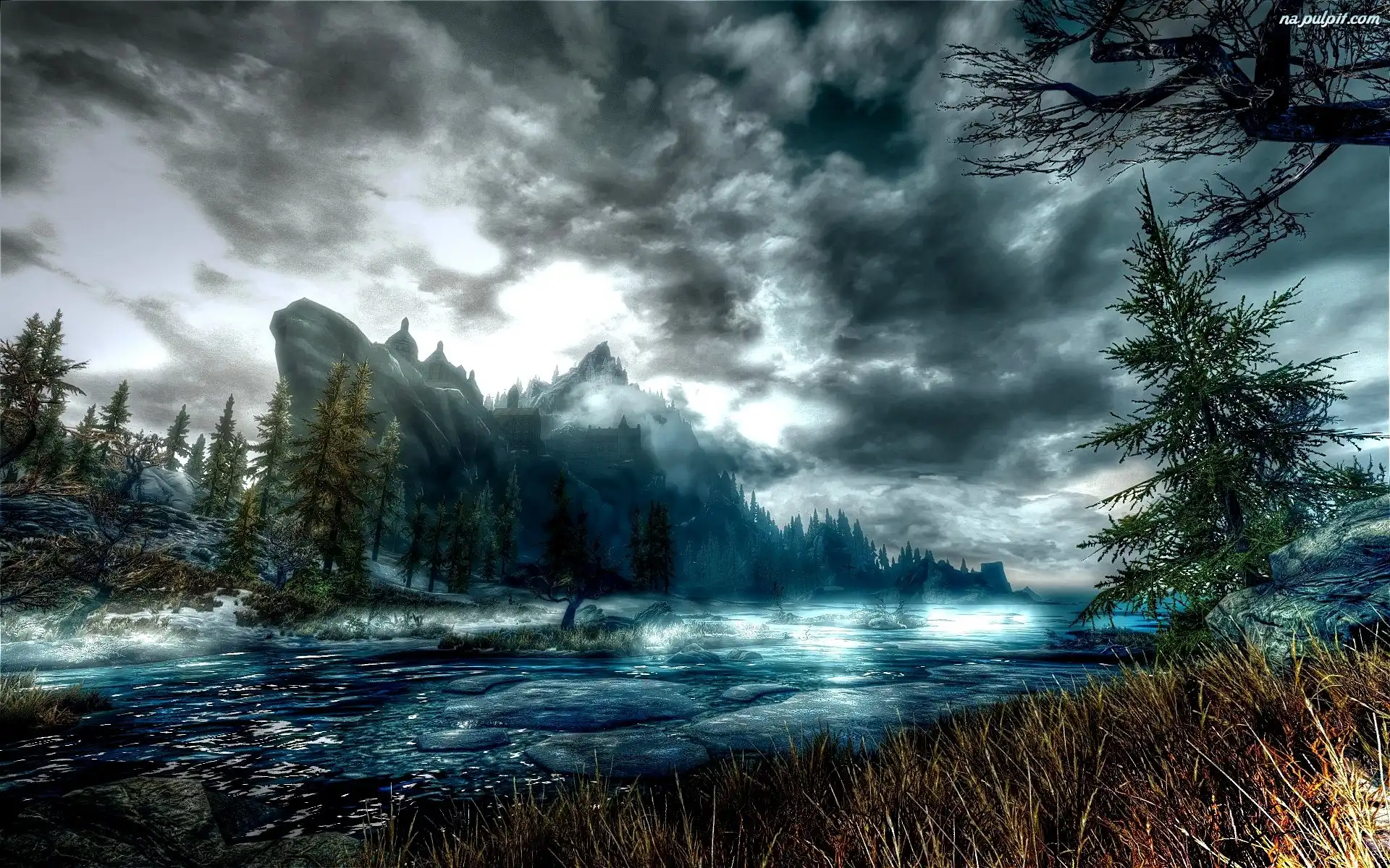 Skała, Choinki, Rzeki, Chmury Na Pulpit