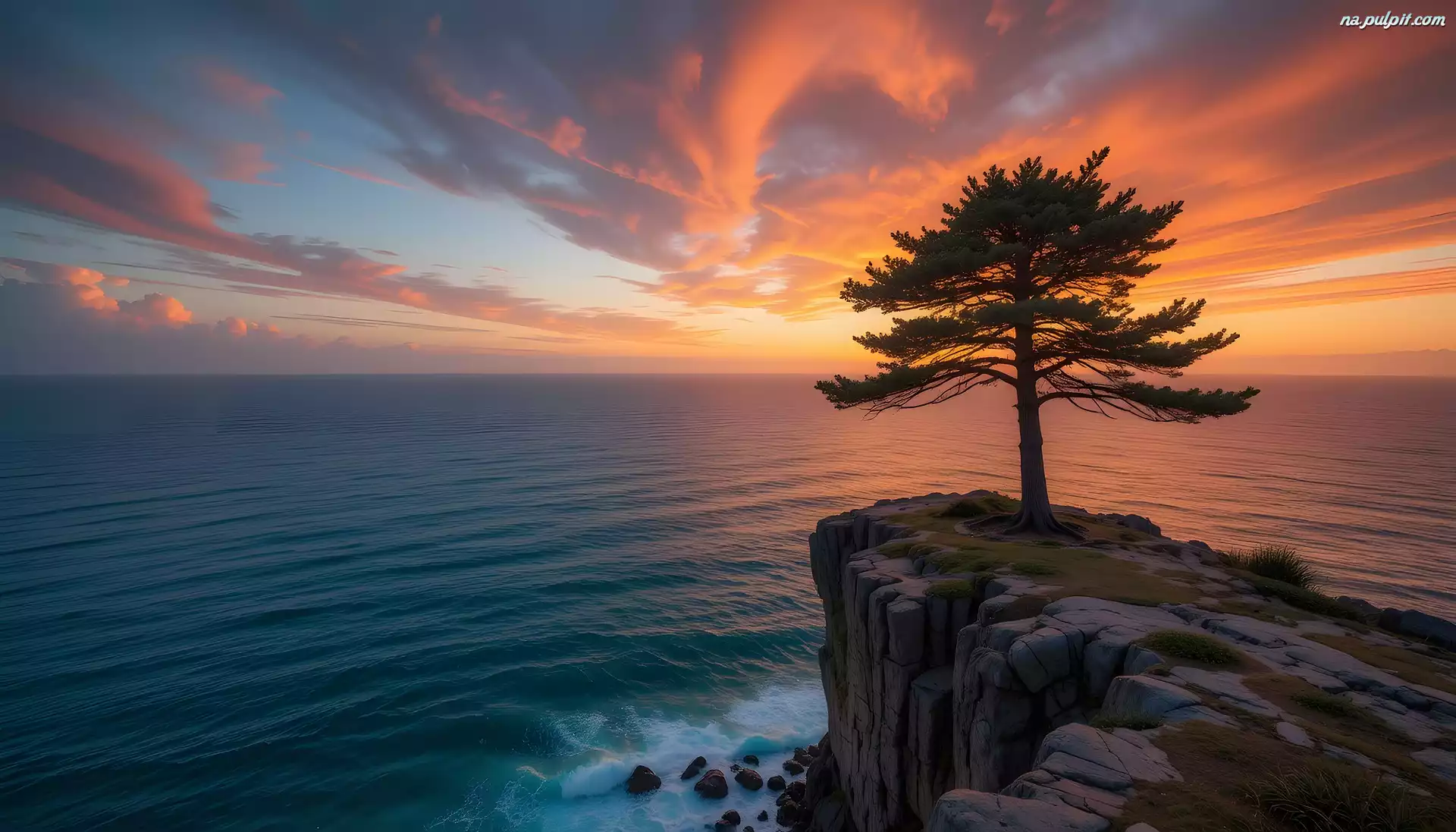 Morze, Skała, Sosna, Zachód słońca Na Pulpit