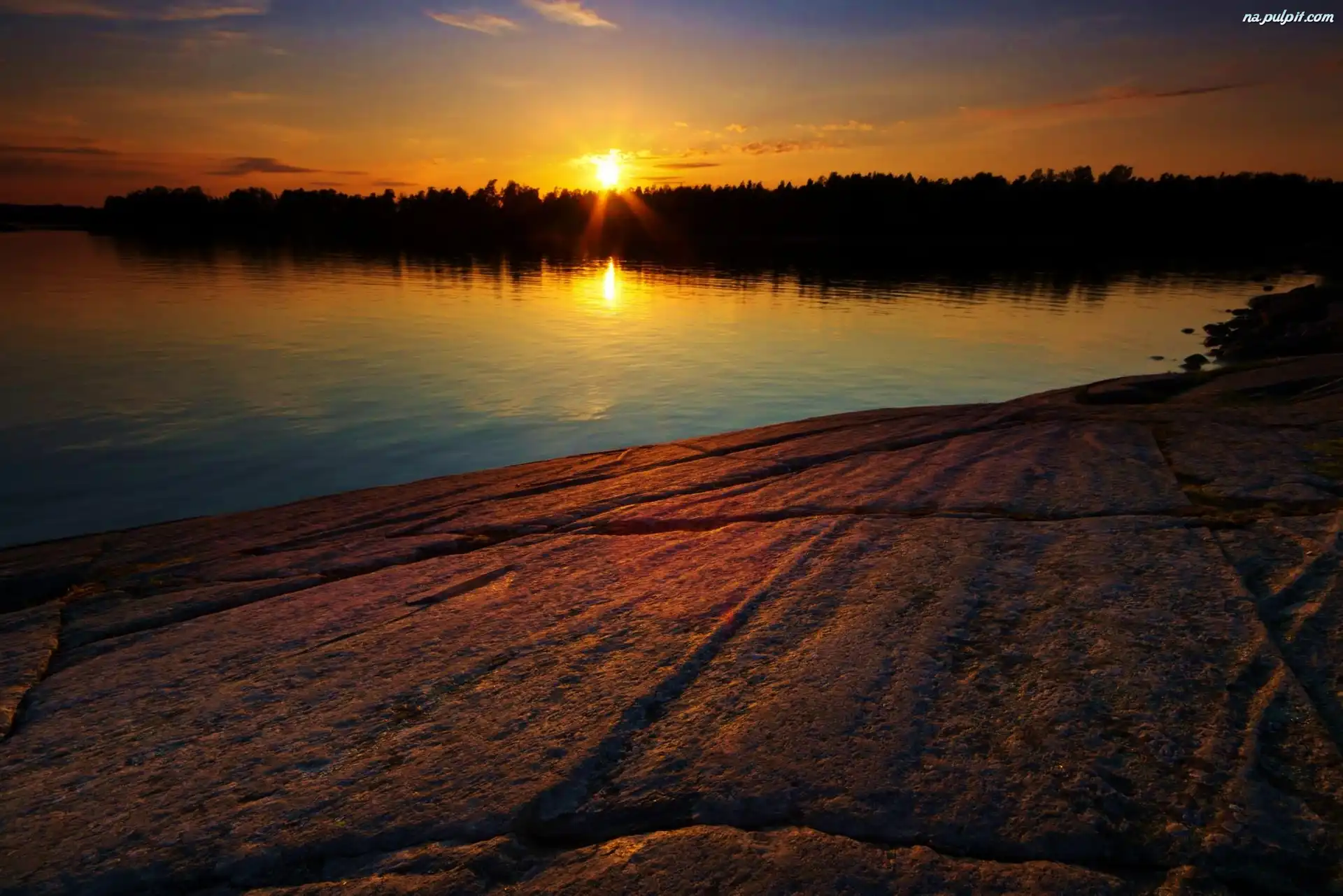 Skała, Słońca, Zachód, Jezioro Na Pulpit