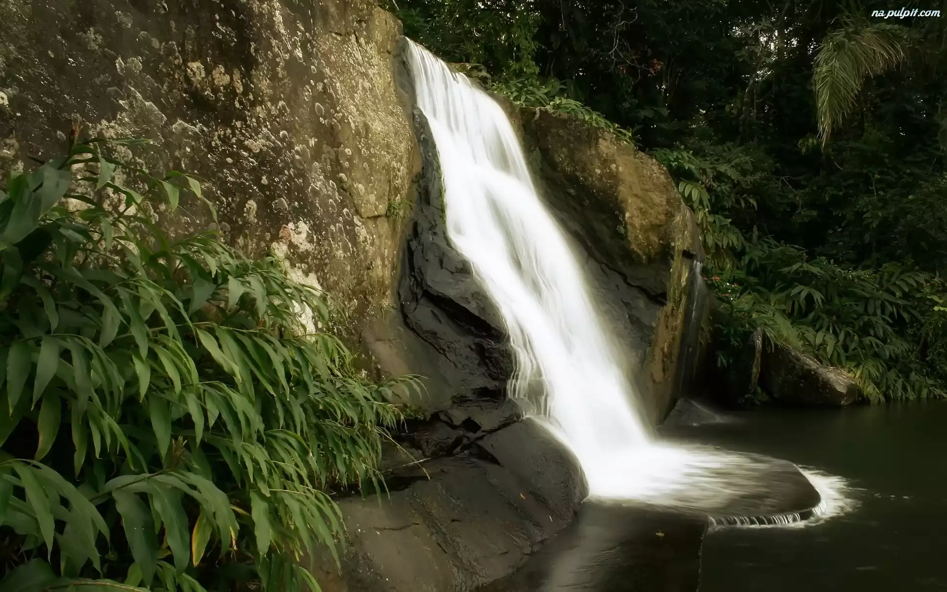 Skała, Rzeka, Krzewy, Zielone, Wodospad