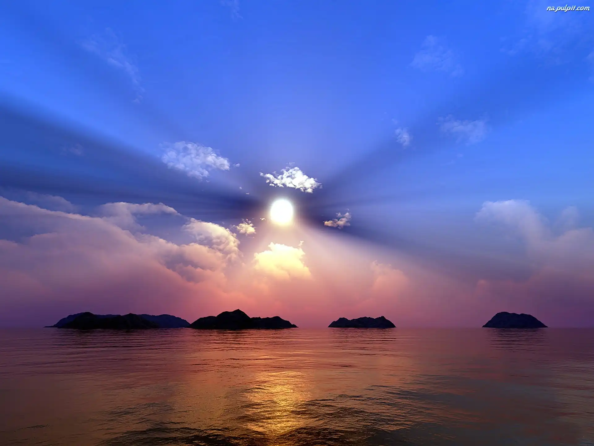 Skaliste, Promienie, Słońca, Wyspy, Morze, Chmury Na Pulpit