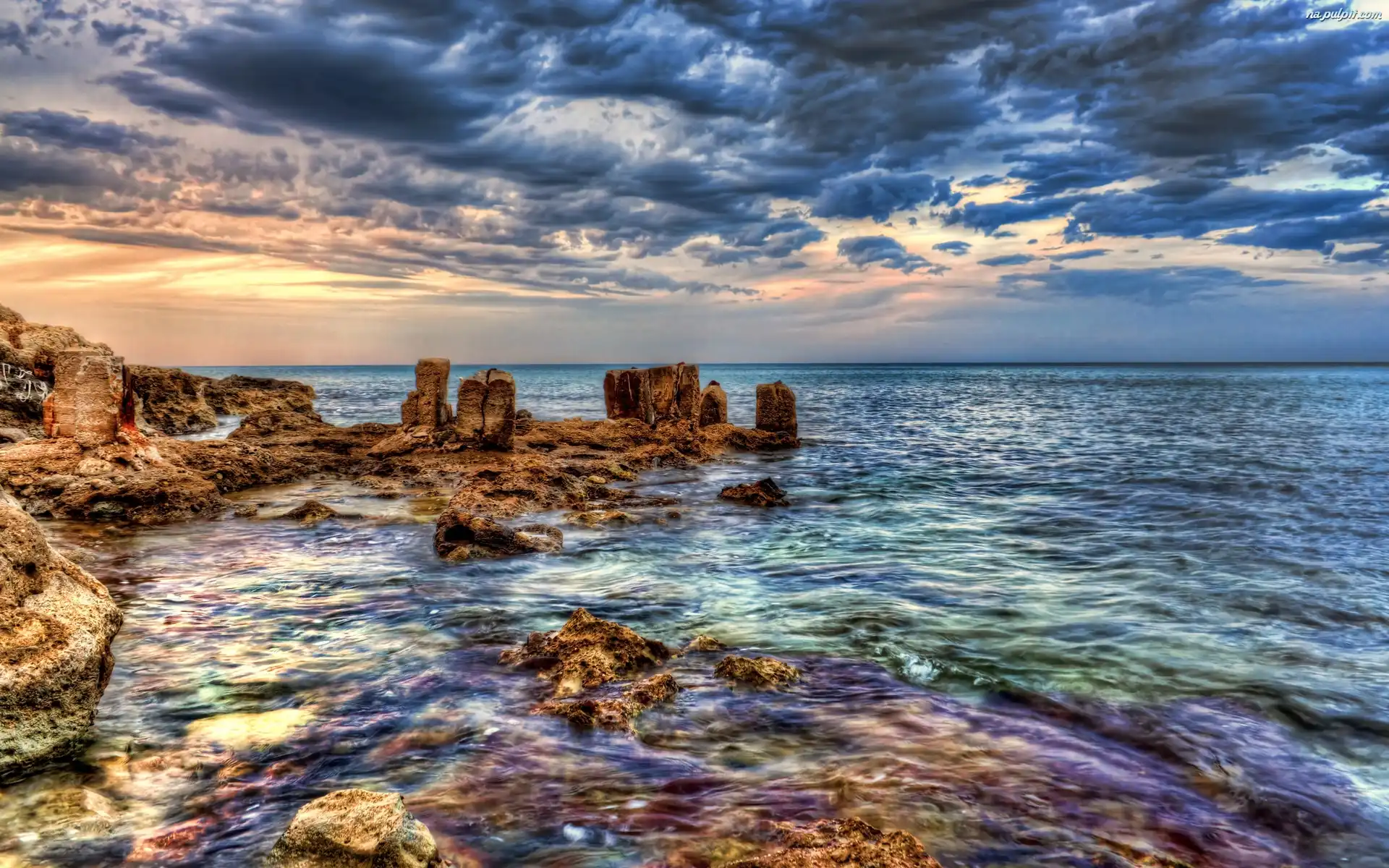 Skałki, Niebo, Zachmurzone, Morze Na Pulpit