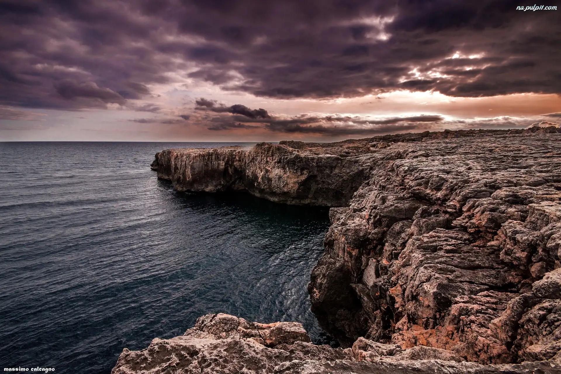 Skałki, Chmury, Słońca, Zachód, Morze Na Pulpit