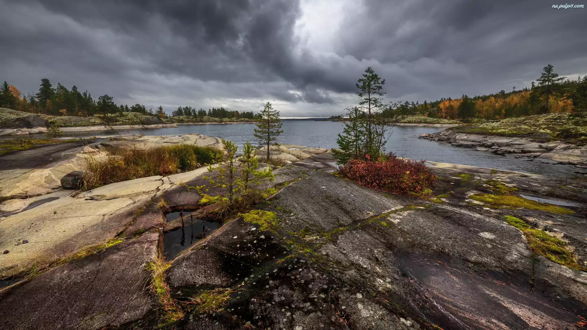 Drzewa, Ładoga, Ciemne, Rosja, Jesień, Chmury, Jezioro, Skały Na Pulpit