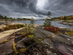 Drzewa, Ładoga, Ciemne, Rosja, Jesień, Chmury, Jezioro, Skały