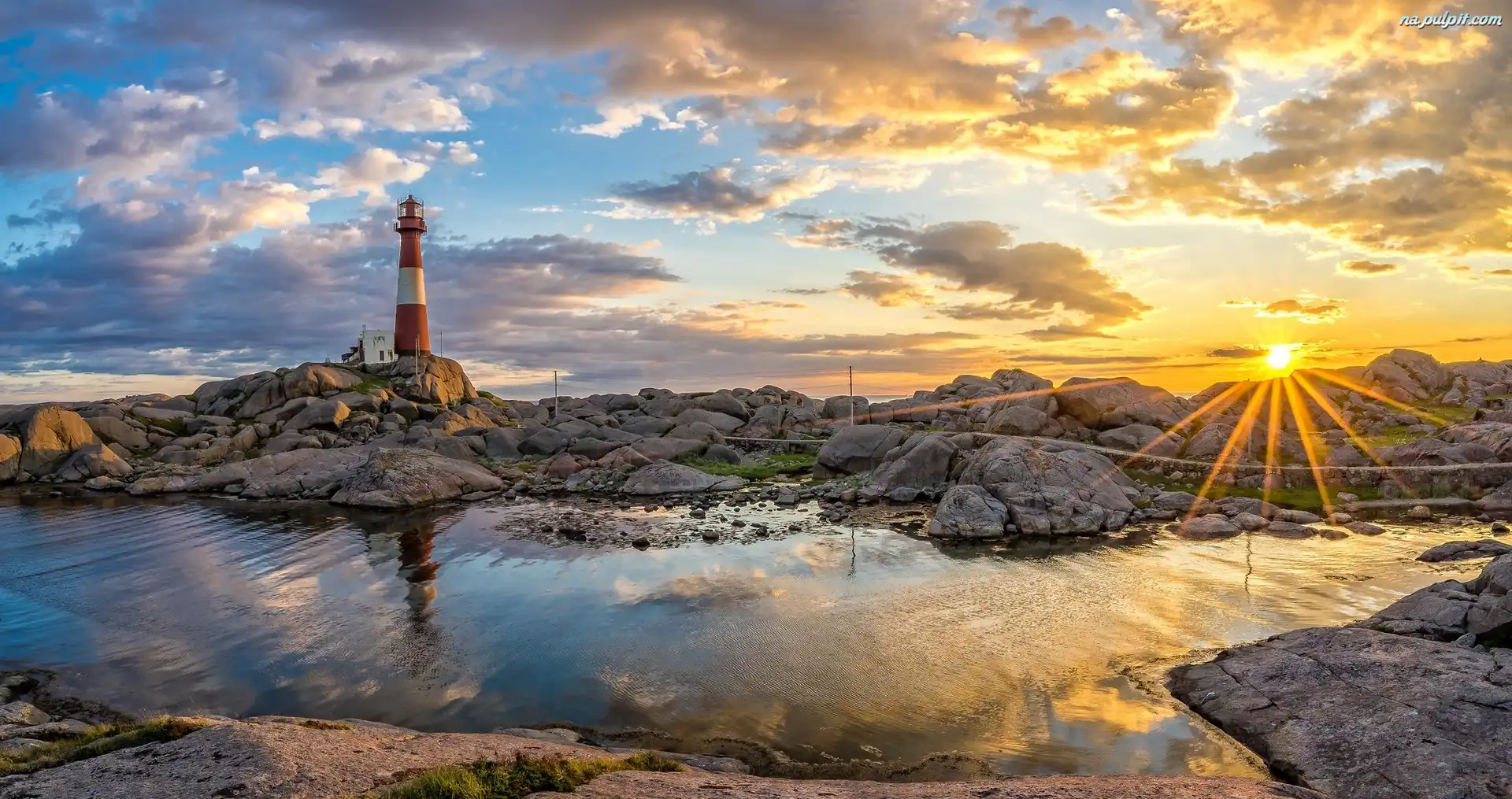 Skały, Gmina Egersund, Wyspa Midbrodoya, Chmury, Wschód słońca, Latarnia morska Eigeroy, Norwegia, Wybrzeże Na Pulpit |