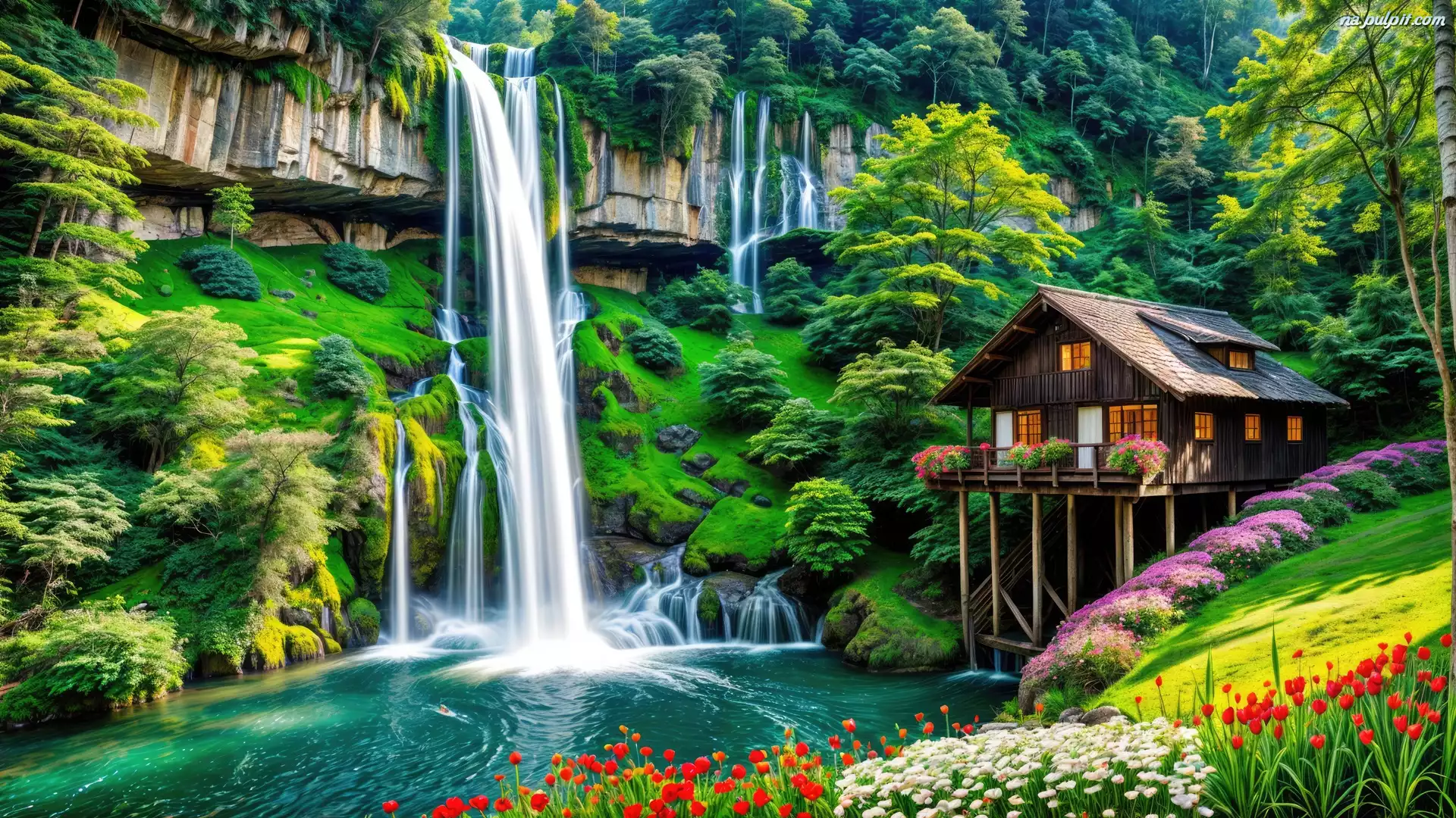 Wodospad Skały, Dom, Drzewa, Kwiaty Na Pulpit