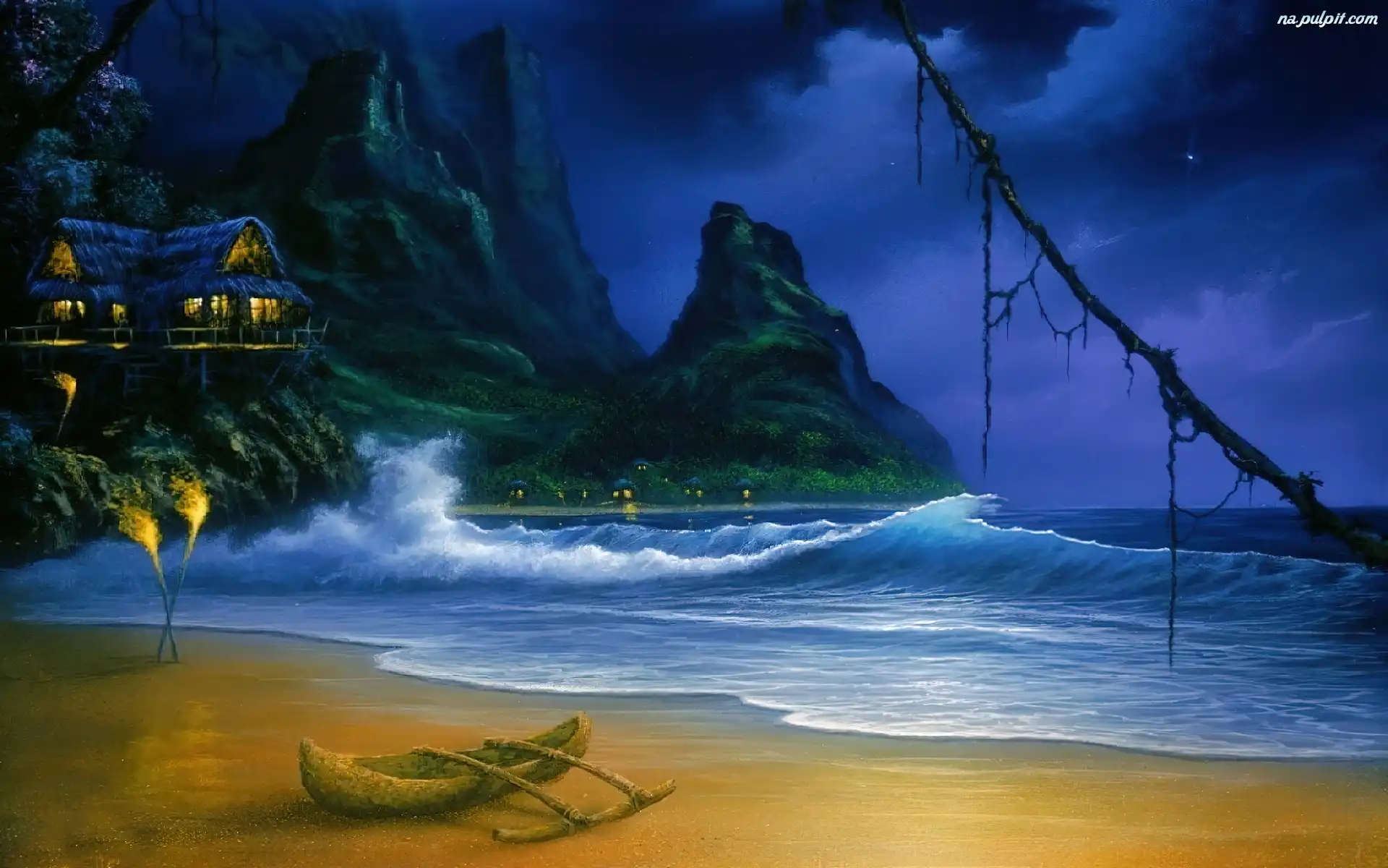 Skały, Łódka, Noc, Morze, Dom, Plaża Na Pulpit