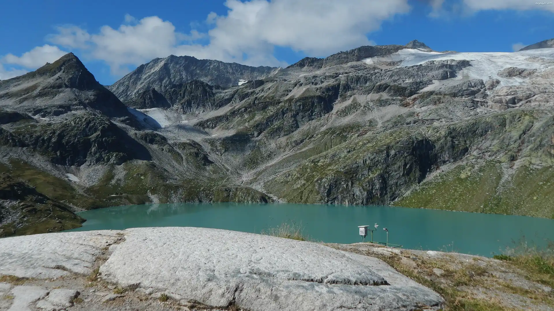 Skały, Błękitne, jezioro, Góry, Niebo