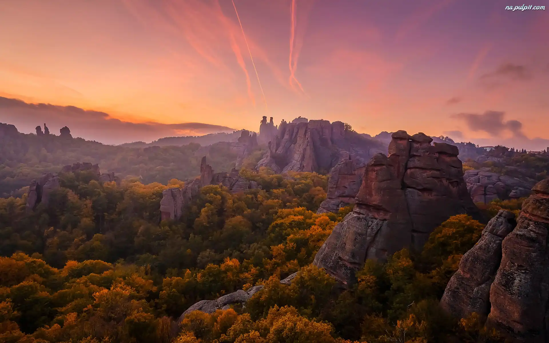 Zachód słońca, Góry, Chmury, Jesień, Las, Drzewa, Skały Na Pulpit