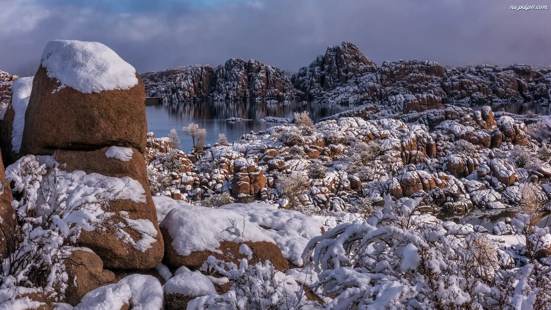 Śnieg, Jezioro, Skały, Zima Na Pulpit