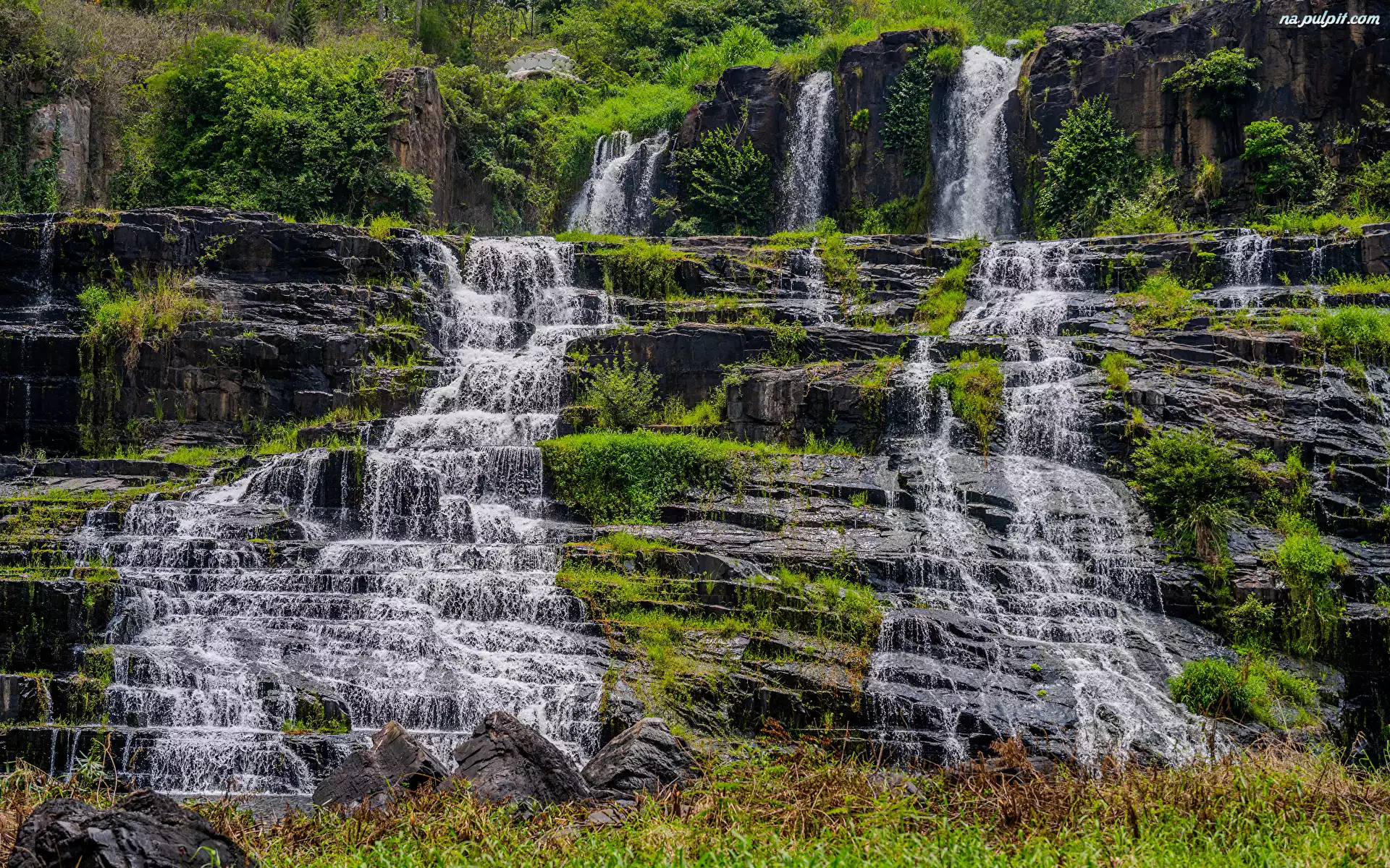 Rośliny, Omszałe, Kaskada, Wietnam, Wodospad, Pongour Dalat, Skały